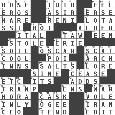 ACROSS 1. Stockings 5. Ballerina skirt 9. Snakelike fish 12. Greek god of love 13. SW Saudi Arabia district 14. Celtic language 15. Female horse 16. Painter Guido (1575-1642) 17. Globular water bottle used in Asia 18. Fast jet (abbr.) 19. Being at a high temperature 21. Tree or shrub in the Birch family 22. Slanted text style (abbr.) 24. The 23rd letter of the Hebrew alphabet 26. Car or cant ending 27. Took without asking 28. One of the Great Lakes 29. The visible part of the earth's surface 30. Motion picture award 32. Get outta here! 36. Calm and collected 37. Luau course 38. Bowlike part 39. Taverns 40. Table seasonings 42. Old wives' tales, e.g. 43. Trig term 44. Desist 46. And so on (abbr.) 49. It is 50. Does sums 51. _____ steamer (cargo ship) 53. Followers of ems 54. Armed conflict 57. Israeli folk dance 58. Keg 61. Short-tailed, large-bodied rat 62. In an inward manner 63. Double curve, resembling the letter S 64. SW Asia republic 65. Corporate head (abbr.) 66. Be inclined (to) 67. Prepare for publication DOWN 1. Folds over and sews together 2. Mouths or openings 3. Conclusion 4. Compass dir. 5. Small pie 6. Purpose 7. Metal container 8. RI univ. 9. Wear away 10. First name in cosmetics 11. Acquire or gain knowledge or skills 14. Pipe bend 19. Actor Linden 20. Butter sub 21. Deep reverence 23. For Whom the Bell _____ 24. Distinguishing feature 25. Atmosphere 27. Within a short period 28. Learning spot: Fr. 29. _-fi 31. Connects, as a bridge 32. First course 33. What you're doing now 34. Land measure 35. Definite Article 40. Be seated 41. Examine hastily 43. Small drink 45. Begley and Asner 46. Moral principle 47. Heavy duty weighing machine 48. Monte _, Las Vegas Hotel/Casino 52. Fifth month 53. Made supply last 55. Jai ____ 56. Monthly bill 58. Small bed 59. Mature 60. Elected rep. 61. Compete