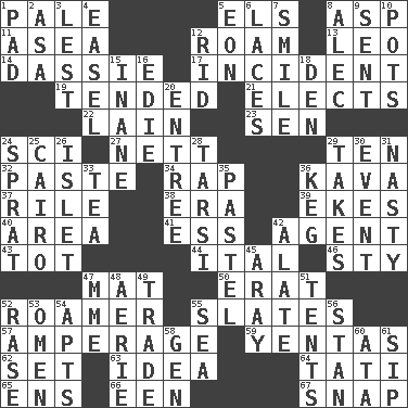 ACROSS 1. Light colored 5. Raised railways 8. Cleo's killer 11. At sea 12. Wander 13. Lion 14. Hyrax 17. Event 19. Watched over 21. Chooses 22. (Had) reclined 23. Elected rep. 24. _-fi 27. Remaining after all deductions 29. "___ Little Indians" 32. Thick mixture 34. Strike 36. Polynesian shrub of the pepper family 37. Cause heat under the collar 38. Epoch 39. Makes supply last 40. Type of rug 41. Curvy letter 42. Representative 43. Small child 44. Slanted text style (abbr.) 46. Filthy place 47. Floor protector 50. Part of Q.E.F. 52. Wanderer 55. Chalkboards 57. Electrical Measurement 59. Gossips 62. Put into a specified state 63. The main thing one is thinking about 64. Jacques of French films 65. Followers of ems 66. Car or cant ending 67. Fastener DOWN 1. Groovy apt. 2. White ___ sheet 3. For fear that 4. Artist's stand 5. Period of immesurable duration 6. Shoestrings 7. Grin 8. Actor Baldwin 9. Posted 10. Plant holders 12. To free from 15. Silly 16. Singer Brickell 18. Lair 20. Main course 24. Small fatty European fish 25. Capital of Egypt 26. Small island 28. Tarsus (plural) 29. Proceeds 30. Happening 31. Characterized by obscenity 33. Beverage made from leaves 35. Soft color 36. Barrel 42. Having winglike extensions 45. Like ___ of sunshine 47. Madame (abbr.) 48. Nest on high 49. Exchange 51. Portable shelters 52. Raze (variant) 53. Sign of something about to happen 54. Tenement units (abbr.) 55. Ocean 56. Comedian Laurel of Laurel & Hardy 58. Commissioned military rank (abbr.) 60. "One Day ___ Time" 61. Small drink