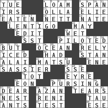 ACROSS 1. Third day of the wk. 4. Rich soil 8. Connect, as a bridge 12. Big collection agency 13. Spanish pot 14. Writer Wiesel 15. Ingested 18. Remaining after all deductions 19. Nathan's nickname 20. Small, flat, pigmented spot on the skin 22. Can I? 23. Prepare for publication 24. Dripping 25. Fast jet (abbr.) 26. Manned the helm 30. On the contrary 33. Sea 36. Trust 37. On the rocks 39. Possessed 40. Comedian Laurel of Laurel & Hardy 41. Mountain range southwest of Kyrgyzstan 42. Taiwanese island in East China Sea 44. Compass dir. 45. More disrespectful 47. Compass dir. 50. Small child 51. Jane of fiction 53. Period of immesurable duration 54. Puckering 57. Letter starter 59. Muslim summons to prayer 61. Lacerates 63. A home for chicks 64. Painter Guido (1575-1642) 65. The 19th letter of the Greek alphabet 66. Pismires 67. Trial 68. Compass dir. DOWN 1. Neckwear 2. Mountain range 3. First name in cosmetics 4. Protracted 5. Margarine 6. Keyboard modifier key 7. Floor covering 8. Elected representatives 9. Romp 10. Small island 11. Born 16. Extremities 17. Nuclear Threat Initiatives 21. "Tell ____ the Marines!" 22. Cartoonist voice _ Blanc 24. Acquire through effort 26. Groovy apts. 27. False hair 28. Style 29. Unit of force 30. Prejudice 31. Southern CA. univ. 32. Beverages made from leaves 34. Burn to charcoal 35. Erode 38. What propaganda does 42. Was introduced to 43. One who makes use of a thing 46. Electrically charged atom 48. System (abbr.) 49. 4th largest of the Great Lakes 52. Related on the mother's side 53. 90 degrees 54. Baking dishes 55. A single undivided whole 56. Pate de foie ____ 57. Heredity factor (abbr.) 58. Car or cant ending 59. Nonscientific branch of learning 60. Last letter of the English alphabet 62. Take to court