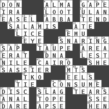 ACROSS 1. Spanish title 4. _ mater 8. Stare wonderingly 12. Retirement account (abbr.) 13. Plunder 14. Uhlan (variant) 15. Artist's stand 18. Swedish rock group 19. Be inclined (to) 20. Deli grouping 22. Had dinner 23. Louse (plural) 24. Australian flightless bird 25. Sight organ 26. Catching in a trap 30. Plant excrement 33. Grayish beige 36. Type of rug 37. Part of Q.E.F. 39. Heredity factor (abbr.) 40. For fear that 41. The longest river in the world 42. Capital of Egypt 44. A female animal or person 45. More disrespectful 47. Mountains (abbr.) 50. Ring climax 51. Snakelike fish 53. Make a knot 54. Ingest 57. Compact _ 59. Volcanic refuse 61. Lacerates 63. Of or related to the anus 64. Drink excessively 65. Compass dir. 66. Have the gumption 67. Domed church section 68. Layer DOWN 1. Pass on 2. Mouths or openings 3. Rhinal 4. Jai ____ 5. Tennis shots 6. Crowd into 7. _ moment's notice (2 wds.) 8. From the throat 9. Toward shelter 10. Baking dish 11. Conclude 16. Writer Wiesel 17. Made of lace 21. Rendezvous 22. Nursemaid (var.) 24. Compass dir. 26. Coast Guard woman 27. Angers 28. Tender 29. Yard entry 30. Elected reps. 31. Operatic vocal solo 32. Friends 34. The sixth month of the Jewish calendar 35. Single; one (prefix) 38. One of the two male reproductive glands 42. Corporate head (abbr.) 43. Sign of things to come 46. Mamie's mate 48. Trial 49. Turn sharply 52. Box-office sellout 53. Russian ruler of old 54. Smile enhancers 55. Double curve, resembling the letter S 56. Celtic language 57. Male parent 58. _ tizzy (2 wds.) 59. R.R. building 60. Chop off 62. Elected rep.