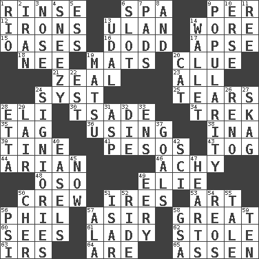 ACROSS 1. Wash lightly 6. Health resort 9. For each 12. Metal shackles 13. ____ Bator, Mongolia 14. Had on 15. Fertile tracts in a desert 16. Texas town _ City 17. Domed church section 18. Born 19. Floor protectors 20. A slight indication 21. Ardor 23. Everything 24. System (abbr.) 25. Lacerates 28. Connecticut Ivy Leaguer 30. Sadhe (variant) 34. Long journey 35. Label 36. Exploiting 38. _ tizzy (2 wds.) 39. Prong on a fork 41. Mexican monetary units 43. Coat; cloak 44. Believer in; advocate of (suffix) 46. Painful 48. Bear (Spanish) 49. Writer Wiesel 50. Ship's personnel 51. Angers 53. Nonscientific branch of learning 56. Silvers or Donahue 57. SW Saudi Arabia district 58. Relatively large 60. Perceives with the eye 61. Kenny Rogers chart-topper in '80 62. Took without asking 63. Big collection agency 64. "We ___ not amused" (Victoria) 65. NE Netherlands city DOWN 1. _ de Janeiro 2. SW Asia republic 3. Sense of smell 4. Dwarf with a sinus problem 5. Curvy letter 6. Slit 7. Groovy apts. 8. Plus 9. Teen's desire 10. Celtic language 11. To separate or throw off 13. Hereditary estate 14. Place for singles 19. Taiwanese island in East China Sea 20. Domesticated feline 22. Eastern Standard Time (abbr.) 24. Seigniories (variant) 26. Former U.S. Attorney General Janet 27. Heroin 28. Singer James 29. Den 31. Viper 32. Pass on 33. Followers of ems 37. Scores awarded for successful feats 40. Artist's stands 42. _-fi 45. At this time 47. Centers 49. Suggestive of the supernatural 50. "Mermaids" star 51. Austrian river, tributary to the Danube 52. Travel on an animal 54. Vintage cars 55. Lie 56. Air pressure measure (abbr.) 57. According to 58. Girls' org. (abbr.) 59. "___ Little Indians"