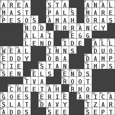 ACROSS 1. Length times width 5. R.R. building 8. Of or related to the anus 12. Vertical spar for supporting sails 13. Friends 15. Female horse 16. Mexican monetary units 18. Nanny 19. Mouths or openings 20. Allow head to fall sleepily 22. The state or an instance of erring 24. Mountain range southwest of Kyrgyzstan 26. Ovum 27. Grant temporary use of 28. Binary compound 29. Everything 32. Welt 35. Lodging establishments 37. Superhero pair 38. Whirlpool 39. Chief or king in Benin or Nigeria 40. Moist 41. Neckwear 42. Comedian Laurel of Laurel & Hardy 43. Naughty children 44. Elected rep. 45. Raised railways 46. Conclusions 49. Federal power corp. 50. Carrot, for example 51. Leopard's kin 55. 17th letter of the Greek alphabet 56. Moves 57. 4th largest of the Great Lakes 59. N. Chile seaport 63. Narrow board 64. American folk hero Crockett 65. Russian ruler 66. Sums up 67. Observe 68. Back-to-school mo. DOWN 1. Electrical Unit 2. Actress Charlotte 3. Curvy letter 4. Without tonality 5. Health resort 6. Docile 7. Having or resembling wings 8. Amid 9. Drug cop 10. Like ___ of sunshine 11. French article 14. Fragments 17. Not divided or shared with others 21. One of the 12 tribes of Israel 23. Ripen 25. Foolish or stupid persons 28. Sillier 29. First of billions? 30. Mass 31. Chops off 32. Soaks 33. Singer Brickell 34. An important port of Yemen 36. Basketball assoc. 40. What propaganda does 42. Scheduled 45. Night before a holiday 47. Not either 48. Capital of the state of Qatar 49. Trials 51. Chilled 52. Froth on beer 53. Ancient river in northeast Turkey 54. Hub of activity 56. Girls' org. (abbr.) 58. Sight organ 60. Ending with capital 61. Head covering 62. Tate display