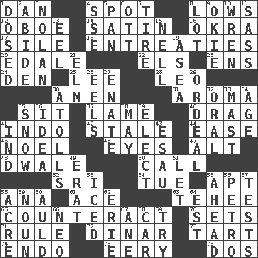 ACROSS 1. Daniel's nick name 4. Specific locale 8. Coldest temperatures 12. Mitch Miller's instrument 14. Smooth fabric 16. Gumbo ingredient 17. Drop; flow; fall 18. Pleas 20. Peak District village in England 22. Raised railways 23. Followers of ems 24. Lair 25. Area sheltered from the wind 28. Lion 30. So be it 31. Scent 35. Be seated 37. Unable to walk 40. To draw with force 41. _ china 42. Having lost freshness 44. Relaxation 45. Christmas carol 46. Sight organs 47. Keyboard modifier key 48. A sleeping potion; an opiate (poet.) 50. Give a ring to 52. _ Lanka 54. Third day of the wk. 55. Fitting 58. Santa ___, CA 61. Adept person 63. Giggle 65. Neutralize 70. Arranges properly for use 71. General guideline 72. Middle Eastern gold or silver currency 73. Small pie 74. Inside; within (prefix) 75. Suggestive of the supernatural 76. Two (Sp.) DOWN 1. Administered medicine 2. Remain 3. Pitcher Ryan 4. Compass dir. 5. Baking dish 6. Baseball player Mel 7. Hoop that covers a wheel 8. Car dealer's back yard 9. Migrant worker of the '30s 10. Songbird 11. Backtalk 13. Snakelike fish 15. 1994 drama film starring Jodie Foster 19. At sea 21. Shade tree 26. Snakelike fish 27. Maternal 29. Severe or trying experience 30. Ringlike coral islands and reefs 32. Taken by mouth 33. Vertical spar for supporting sails 34. Grow older 35. Frozen precipitation 36. The main thing one is thinking about 38. Can I? 39. Voters do this 41. Working for oneself (abbr.) 43. He sold his birthright 49. Part of Q.E.F. 51. Allow 53. On the rocks 55. At or in the front 56. Stone: prefix 57. Trials 58. Land measure 59. Part of speech 60. Old (Scot.) 62. One of the Great Lakes 64. Eastern Standard Time (abbr.) 66. Modern: prefix 67. One (Scot) 68. Automobile 69. Attempt to accomplish something