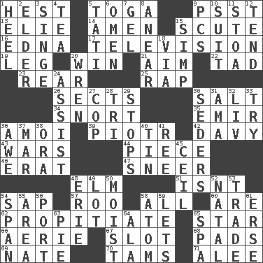 ACROSS 1. Command 5. Ancient Roman robe 9. Inconspicuous attention getter 13. Writer Wiesel 14. So be it 15. Scutum 16. Pulitzer Prize-winning author Ferber 17. Boob tube 19. Part of a journey 20. Acquire through effort 21. Direct toward a target or goal 22. Small amount or degree 23. Hitchcock's "____ Window" 25. Hit sharply and swiftly 26. Religious groups 30. Table seasoning 34. Derisive sound 35. Independent ruler or chieftain 36. Mine, in Marseilles 39. Peter (Polish) 42. _ Jones' Locker 43. Armed conflicts 44. Part 46. Part of Q.E.F. 47. Contemptuous expression 48. Shade tree 51. Is not 54. Plant excrement 57. Friend of Pooh 58. Everything 60. "We ___ not amused" (Victoria) 62. Appease 65. Play the lead 66. Nest on high 67. Narrow, elongated depression 68. Groovy apts. 69. Nathan's nickname 70. Scottish caps 71. Toward shelter DOWN 1. The bottom of a shoe or boot 2. A person who is older than you are 3. Scorch 4. Afternoon social gathering 5. Jacques of French films 6. Sign of things to come 7. Set 8. Approach 9. Personal Computers (abbr.) 10. Costume for a special activity 11. Portico 12. Be inclined (to) 15. Simple or foolish person 18. By way of 20. Songbird 24. Aid 27. Police officer (slang) 28. Three (prefix) 29. Constricts 30. Spring feasts 31. Wet nurse (var.) 32. 54 in ancient Rome 33. Attempt to accomplish something 36. Deep reverence 37. Impair 38. Mouth or opening 40. Shallow baking pan 41. Portuguese money of account (variant) 45. To provide with a ceiling 48. 4th largest of the Great Lakes 49. Car dealer's back yard 50. Wet 52. Relating to or accompanying birth 53. Exchange 54. Connect, as a bridge 55. Length times width 56. Sweet dark-red dessert wine 58. Smallest unit of an element 59. Allows 61. Celtic language 63. Sliced dessert 64. According to 65. Health resort