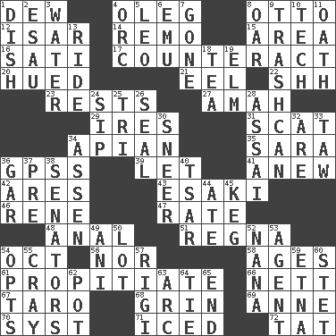 ACROSS 1. Morning condensation 4. Cassini of fashion 8. "Beetle Bailey" pooch 12. Austrian river, tributary to the Danube 14. San ____ (Riviera town) 15. Type of rug 16. Suttee (variant) 17. Frustrate 20. Became colored 21. Snakelike fish 22. Quiet! 23. Musical pauses 27. Nursemaid 29. Angers 31. Scram, to a cat 34. Bee-related 35. "Two Mules for Sister ____" 36. Global Positioning Systems (abbr.) 39. Allow 41. Afresh 42. Ancient Greek god of war 43. 1973 Nobel Price Winner (Physics) Leo 46. French philosopher Descartes 47. Assign a rank or rating to 48. Of or related to the anus 51. Canadian anthropologist Darnell 54. Sep. follower 56. Or not 58. Matures 61. Appease 66. Remaining after all deductions 67. Edible starchy tuberous root 68. Amused look 69. Queen of England 1702-14 70. System (abbr.) 71. On the rocks 72. Make lace DOWN 1. Food container 2. Son of Isaac 3. Wetness 4. The grampus (Milton) 5. Lion 6. Australian flightless bird 7. Went 8. Rowing implement 9. File 13 10. Georgia ____ (Atlanta school) 11. Pledge 13. Travel on or in a vehicle 18. Beverage made from leaves 19. Shade tree 24. Small drink 25. Three (prefix) 26. Lick closed 28. Slender Brazilian palm 30. Scornful expression 32. "We ___ not amused" (Victoria) 33. The 23rd letter of the Hebrew alphabet 34. NE Netherlands city 36. Slender fish 37. Before (prefix) 38. Legislators 40. Russian ruler of old 44. Had dinner 45. Barrel 49. Cuckoo 50. Car dealer's back yard 52. Grandmother 53. Rep 54. Chooses 55. Supercomputer manufacturer 57. Swiss mountan, "Queen of the Mountains" 59. Inactive volcano in Sicily 60. Proofreading order 62. Cooking vessel 63. Curve 64. Neckwear 65. Conclude