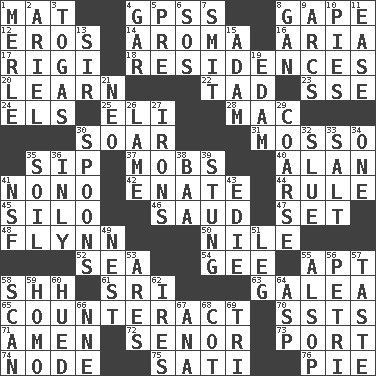 ACROSS 1. Floor covering 4. Global Positioning Systems (abbr.) 8. Open wide 12. Greek god of love 14. Odor 16. Operatic vocal solo 17. Swiss mountan, "Queen of the Mountains" 18. Dwellings 20. Acquire or gain knowledge or skills 22. Small amount or degree 23. Compass dir. 24. Raised railways 25. Biblical high priest 28. Apple computer (short form) 30. Fly high 31. With motion or animation 35. Small drink 37. Crowds into 40. ____ Jay Lerner 41. Words to Nanette 42. Maternal 44. Governing power 45. Grain storage tower 46. Saudi Arabian king (1953-1964) 47. Arrange properly for use 48. Film actor Errol 50. The longest river in the world 52. Ocean 54. Unit of force equal to gravity 55. Fitting 58. Quiet! 61. Indian title of respect (Mr.) 63. An organ shaped like a helmet 65. Neutralize 70. Fast planes 71. So be it 72. Sir (Sp.) 73. Left side of a ship or aircraft 74. Connecting point 75. Suttee (variant) 76. Sliced dessert DOWN 1. Haggard of country music 2. Satellite of Uranus 3. Ancient Roman robes 4. Slender fish 5. Before (prefix) 6. Distress signal 7. Stricken, poetically 8. Separate the seeds from cotton 9. Arches 10. Sliced desserts 11. Comfort 13. Title for a knight 15. First of billions? 19. Dutch treat 21. Modern: prefix 26. Unable to walk 27. Removes the wrinkles 29. Unrefined 30. Soup utensils 32. Change direction abruptly 33. Table seasoning 34. Single 35. The visible part of the earth's surface 36. In an inward manner 38. Sound made by sheep 39. Feeling sharp psychological pain 41. Overdraft (abbr.) 43. Singer Brickell 49. A home for chicks 51. Part of a journey 53. Ancient Greek god of war 55. Columnist Joseph or Stewart 56. _ dish (used to culture cells) 57. Clothes sense 58. Skim 59. Like (prefix) 60. Took on color 62. Angers 64. Cleo's killer 66. Compass dir. 67. Santa ___, CA 68. Small bed 69. Three (prefix)