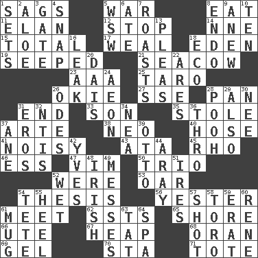 ACROSS 1. Droops 5. Armed conflict 8. Ingest 11. Enthusiasm 12. Cease 14. Compass dir. 15. Add up to 17. Welt 18. Locale of original sin 19. Oozed 21. Manatee 23. Auto club (abbr.) 25. Pacific island yam 26. Migrant worker of the '30s 27. Compass dir. 28. Baking dish 31. Conclusion 33. Boy, to dad 35. Fur scarf 37. Johnson of "Laugh-In" 38. Modern: prefix 40. Stockings 41. Annoyingly loud 43. "One Day ___ Time" 45. 17th letter of the Greek alphabet 46. Curvy letter 47. Zeal 50. Musical group of three 52. Past tense of be (plural) 53. Rowing implement 54. College paper 56. Last 61. Rendezvous 62. Fast planes 65. Dinah or Pauly 66. Shoshoni 67. Pile 68. NW Algerian seaport 69. Set 70. R.R. building 71. Lug DOWN 1. Arranges properly for use 2. _ vera 3. Yard entry 4. Fastener 5. Compass dir. 6. Had dinner 7. Cooks with dry heat, as in an oven 8. Inside; within (prefix) 9. Afresh 10. "___ Little Indians" 13. Entreaties 16. Path through which fluid escapes 18. Environmental prefix 20. Raised platform 22. Ancient Greek god of war 24. A really long time 26. Lyric poems 28. "Silly old bear" 29. In addition 30. Born 31. Greek god of love 32. Nuclear Threat Initiatives 34. Teachers' org. 36. Through, poetically 37. A saturated hydrocarbon 39. "Beetle Bailey" pooch 42. Jacques Cousteau's middle name 44. Like ___ of sunshine 48. From or relating to Ireland 49. Makes clutter 51. Angers 52. Dripping 54. Wig 55. Person who is morally reprehensible 57. Went for two points 58. "Corrida" creature 59. Part of Q.E.F. 60. French philosopher Descartes 61. Java container 63. Make lace 64. Health resort