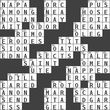 ACROSS 1. California wine valley 5. The grampus (Milton) 8. Ichor 11. Amid 13. Teachers' org. 14. Stockings 15. Pitcher Ryan 16. 24 hours 17. Prepare for publication 18. Small island 19. Scent 21. Canadian anthropologist Darnell 22. San ____ (Riviera town) 24. Cassini of fashion 25. Eats (away) 27. Teat (slang) 29. The Jewish people; Israel 30. Profane or obscene expressions 32. Pulitzer Prize-winning author Ferber 33. Religious groups 35. Story 39. Virtuous person 41. Presage 42. Shoshoni 43. Slept 45. Deli pickle 48. Celtic language 49. Having ears or earlike features 50. Printing process, for short 52. Sorrow 55. Soon (poet.) 56. Make imperfect 57. Any of the three canals of the cochlea 59. Post 60. Call ___ day 61. _ Allan Poe 62. Curvy letter 63. Set 64. Elected reps. DOWN 1. Grandmother 2. Mine, in Marseilles 3. Coward 4. Santa ___, CA 5. Southwest Nigerian state 6. Rump 7. Island 8. Puddle 9. Exploiting 10. Bristle 12. Dwarf 14. The bottom of a shoe or boot 20. Two (Sp.) 21. Writer of Portnoy's Complaint (1969) 23. Ferber et al. 25. Compass dir. 26. To free from 27. Make lace 28. ___ a Wonderful Life 30. Sep. follower 31. Closes up, plugs up 33. Be seated 34. Compass dir. 36. Electrical Measurement 37. Area sheltered from the wind 38. Conclusion 40. Old (Scot.) 43. Fish or hair follower 44. Came up 45. Natives or inhabitants of Denmark 46. Removes the wrinkles 47. Grant temporary use of 49. Comfort 50. Pace 51. Relating to the mouth 53. ____ Bator, Mongolia 54. Hearing organs 56. Russian fighter aircraft 58. Music discs