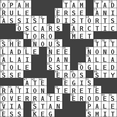 ACROSS 1. Brightly colored fish 5. Scottish cap 8. Small boy 11. Governing power 12. Celtic language 13. Cuckoo 14. Help 17. What propaganda does 19. Motion picture awards 21. Northern region 22. "Corrida" creature 23. Was introduced to 24. A female animal or person 27. Good sense 29. Teat (slang) 32. Dipping utensil 34. Born 36. Words to Nanette 37. Jai _ 38. One of the 12 tribes of Israel 39. Silent film actress Nazimova 40. Lacquered or enameled metalware 41. Fast jet (abbr.) 42. Stared at amorously 43. Compass dir. 44. Greek god of love 46. Filthy place 47. Had dinner 50. Armor plate that protects the chest 52. Food allowance for one day 55. Cylindrical with tapered ends 57. Make much ado about nothing 59. Eats (away) 62. By way of 63. Comedian Laurel of Laurel & Hardy 64. Light colored 65. Double-curved letter 66. Barrel 67. Stricken, poetically DOWN 1. Mouth or opening 2. Fluid product of inflammation 3. In addition 4. Robbery 5. Three (prefix) 6. Indian state 7. Distance measurement (Brit.) 8. Small pie 9. Against 10. Plate 12. Begley and Asner 15. Biscuitlike quick bread 16. Pacific island yam 18. Sep. follower 20. Periods in a boxing match 24. Narrow boards 25. Auras 26. Peak District village in England 28. Gospel singer Marvin 29. For Whom the Bell _____ 30. An arm off of a larger body of water 31. Sycophant 33. Falsehood 35. Main course 36. Tired old horse 42. Flexible twig of a willow tree 45. Legendary monster 47. Wind 48. Cod relative 49. Related on the mother's side 51. Discontinues 52. Be footloose 53. Advice 54. Beverages made from leaves 55. Nine, plus one 56. Dutch treat 58. Label 60. Connecticut Ivy Leaguer 61. Arrange properly for use