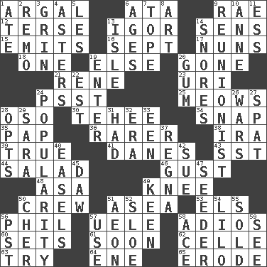 ACROSS 1. Therefore, facetiously 6. "One Day ___ Time" 9. Actress Charlotte 12. Laconic 13. Russian composer Stravinsky 14. Elected reps. 15. Sends forth 16. Back-to-school mo. 17. Religious women 18. Single 19. Otherwise 20. Went 21. French philosopher Descartes 23. RI univ. 24. Inconspicuous attention getter 25. Catcalls? 28. Bear (Spanish) 30. Giggle 34. Fastener 35. Infant food 36. More valued for its uncommonness 38. Lyricist Gershwin 39. Loyal 41. Natives or inhabitants of Denmark 43. Fast jet (abbr.) 44. First course 46. Abrupt rush of wind 48. White ___ sheet 49. Leg joint 50. Ship's personnel 51. Toward the sea 53. Raised railways 56. Silvers or Donahue 57. Ubangi River tributary 58. Goodbye (Sp.) 60. Arranges properly for use 61. Within a short period 62. Cell (Danish) 63. Attempt 64. Compass dir. 65. Wear away DOWN 1. Had dinner 2. San ____ (Riviera town) 3. Broad smile 4. Michaelmas daisies 5. French article 6. Matures 7. Drink excessively 8. Nonscientific branch of learning 9. One who advocates reunion 10. Singer Murray 11. Curvy letter 13. Capri or Wright 14. Sounds asleep 19. Keyboard key 20. Chewing product 22. Eastern Standard Time (abbr.) 24. Teen's desire 26. Armed conflicts 27. Petty quarrel 28. Elects 29. "Two Mules for Sister ____" 31. Possessed 32. Period 33. Car or cant ending 37. Rain (Swedish) 40. Artist's stands 42. Take to court 45. Obsolete 47. Sowing specialist 49. Peachy ____! 50. "Mermaids" star 51. A really long time 52. _ gin 54. _ and Stitch 55. Exchanged or delivered for money 56. Pacific Standard Time (abbr.) 57. Purpose 58. Adept person 59. Perceive with the eye