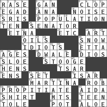 ACROSS 1. Raze (variant) 5. Separate the seeds from cotton 8. Hoof sound 12. Mild oath 13. Santa ___, CA 14. Annoying sound 15. Indian titles of respect 16. Census information 19. "___ Little Indians" 20. Legislator 21. Inactive volcano in Sicily 23. And so on (abbr.) 24. Tate display 27. Petroleums 30. Overwhelm 31. Foolish or stupid persons 34. Singer James 35. Ripens 38. A sleeping potion; an opiate (poet.) 40. "Vaya con ____" 41. A type of plum 42. Moe Howard, for one 44. Coop moms 45. Russian ruler of old 46. Followers of ems 47. Put into a specified state 50. Austrian river, tributary to the Danube 53. Chrissie's court nemesis 57. Director Reiner 59. Appease 63. Opera by Verdi 64. Upper-body garment 65. Mountains (abbr.) 66. Adolescent 67. Lacquered or enameled metalware 68. Cooking vessel 69. _ vera DOWN 1. Relief 2. Match 3. Virtuous person 4. Begley and Asner 5. Open wide 6. At once, immediately (arch.) 7. California wine valley 8. Small bed 9. Cards in a Roman deck? 10. Bear (Spanish) 11. Animal enclosure 14. Drug cop 17. Shoshoni 18. Car dealer's back yard 20. Stated 22. Annoying sounds 24. Opposed to 25. Printing process, for short 26. It was, poetically 28. Flaplike covering 29. Sty mamas 30. Spring feasts 32. Make lace 33. Groove 35. American tennis player Robert 36. Small, secluded valley 37. Immeasurably long periods of time 39. Greek goddess of the dawn 43. Greek goddess of the earth (variant) 47. Stricken, poetically 48. Consume 49. Three (prefix) 51. Satellite of Uranus 52. Cowboy competition 54. Pack (down) 55. "Tell ____ the Marines!" 56. A home for chicks 58. Object of repulsion 59. Pacific Standard Time (abbr.) 60. 17th letter of the Greek alphabet 61. Petroleum 62. Before (prefix) 63. "One Day ___ Time"