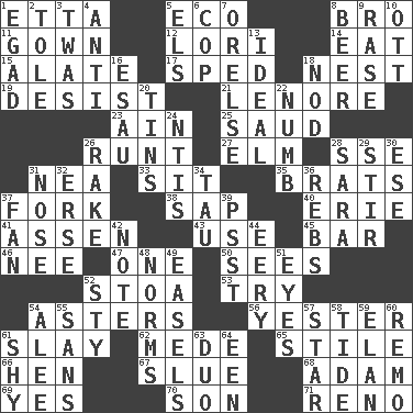 ACROSS 1. Singer James 5. Environmental prefix 8. Sis' sibling 11. Bride's dress 12. Australian parrot (variant) 14. Ingest 15. Having winglike extensions 17. Hurried 18. A home for chicks 19. Cease 21. Poe poem 23. The 18th letter of the Arabic alphabet 25. Saudi Arabian king (1953-1964) 26. Undersized animal 27. Shade tree 28. Compass dir. 31. Teachers' org. 33. Be seated 35. Naughty children 37. Tined utensil 38. Plant excrement 40. One of the Great Lakes 41. NE Netherlands city 43. Purpose 45. Oblong piece of solid material 46. Born 47. Single 50. Perceives with the eye 52. Portico 53. Attempt to accomplish something 54. Michaelmas daisies 56. Next before 61. Kill 62. Ancient Persian 65. Vertical member of a panel or frame 66. Layer 67. Turn sharply 68. First of billions? 69. It is so 70. Manchild 71. Former U.S. Attorney General Janet DOWN 1. Mild oath 2. Lacquered or enameled metalware 3. It was, poetically 4. Against 5. Raised railways 6. Police officer (slang) 7. Threatening words 8. Fermented drink made from hops 9. To erase 10. Baseball player Mel 13. Perfect 16. He sold his birthright 18. Lower and raise head in agreement 20. Canisters 22. Unfeeling 24. Nuclear Threat Initiatives 26. Immoral or dissolute person 28. "Two Mules for Sister ____" 29. Disorderly outburst 30. Compass dir. 31. Characteristic smell of wine 32. Celtic language 34. The 19th letter of the Greek alphabet 36. Confederate soldiers (slang) 37. Avid follower 39. Inconspicuous attention getter 42. Short letter 44. Suggestive of the supernatural 48. Typical models 49. Artist's stands 51. Snake ____ (dice throw) 52. Filthy place 54. Toward shelter 55. Without 57. Play the lead 58. Periodic rise and fall of the sea level 59. Enthusiasm 60. San ____ (Riviera town) 61. Like a shrinking violet 63. Superhero pair 64. Car or cant ending