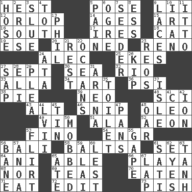 ACROSS 1. Command 5. Airs 9. Cards in a Roman deck? 12. Fourth or lowest deck 14. Grows older 15. Tate display 16. 180 degrees 17. Angers 18. Feline 19. Compass dir. 20. Pressed 23. Former U.S. Attorney General Janet 24. Actor Baldwin 25. Makes supply last 27. Back-to-school mo. 30. Ocean 32. _ de Janeiro 33. Silent film actress Nazimova 34. Small pie 36. 23rd letter of the Greek alphabet 38. Sliced dessert 39. Modern: prefix 40. _-fi 43. The first octave above the treble staff 46. Clip 48. Margarine 49. Zeal 51. According to 52. Age 53. A pale, very dry sherry 54. Engineer (abbr.) 56. Indonesian resort city 58. Greek mezzo-soprano Agnes 61. Arrange properly for use 64. Black tropical American cuckoo 65. Competent 66. Beach, in Buenos Aires 68. Not either 69. Afternoon social gatherings 70. Consumed 71. Ingest 72. Prepare for publication 73. Expression of disdain DOWN 1. Stockings 2. Greek god of love 3. Change direction abruptly 4. Small child 5. Ache 6. Legendary monster 7. Sowing specialist 8. Curvy letter 9. Shoestrings 10. SW Asia republic 11. "Tell ____ the Marines!" 13. Silvers or Donahue 21. Take ten 22. Seas 23. Vintage cars 24. _ moment's notice (2 wds.) 26. Sleep 27. Plant excrement 28. Connecticut Ivy Leaguer 29. Entreaty 31. Sports stadium 35. Bathroom plumbing fixture 37. Capri or Wright 41. Corporate head (abbr.) 42. Electrically charged atom 44. 57 in ancient Rome 45. Shallow baking pan 47. Baking dishes 48. Rowing implement 50. Crowded into 53. Seductive woman who exploits men 55. Open wide 56. Object of repulsion 57. Small Philippine buffalo 59. Jai ____ 60. For fear that 61. Suttee (variant) 62. Snake ____ (dice throw) 63. Hyperbolic tangent 65. Had dinner 67. Pet locale