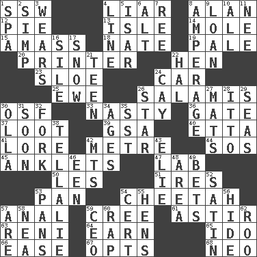 ACROSS 1. Compass dir. 4. One who doesn't tell the truth 8. Actor Alda or Thicke 12. Sliced dessert 13. Capri or Wright 14. Undercover agent 15. Collect or gather 18. Nathan's nickname 19. Light colored 20. Hard copy producer 22. Layer 23. A type of plum 24. 4-wheeled motor vehicle 25. She-sheep 26. Deli grouping 30. Order of Saint Francis (abbr.) 33. Characterized by obscenity 36. Yard entry 37. Plunder 39. Girls' org. (abbr.) 40. Singer James 41. Old wives' tales, e.g. 42. Distance measurement (Brit.) 44. Distress signal 45. Short socks 47. Experiment locale 50. French article 51. Angers 53. Baking dish 54. Leopard's kin 57. Of or related to the anus 59. Algonquian 61. Moving about 63. Painter Guido (1575-1642) 64. Merit 65. Wedding promise 66. Relaxation 67. Elects 68. Modern: prefix DOWN 1. Health resort 2. Simple or foolish person 3. Erodes 4. Actor's bit 5. Austrian river, tributary to the Danube 6. The first octave above the treble staff 7. Portuguese money of account (variant) 8. Electrical Measurement 9. Grant temporary use of 10. Everything 11. Born 16. Filth; sediment 17. Frozen precipitation 21. Adolescent 22. Actor Linden 24. Island 26. Play the lead 27. Floor protectors 28. "Tell ____ the Marines!" 29. Oceans 30. Spanish pot 31. Within a short period 32. Tined utensil 34. Ripens 35. Fast jet (abbr.) 38. Copy Pinocchio 42. Mountains (abbr.) 43. Writer Wiesel 46. Car or cant ending 48. Length times width 49. Wagers 52. Smooth fabric 53. Zero-star reviews 54. Foregone conclusion 55. Coop moms 56. Flintstone garb 57. "We ___ not amused" (Victoria) 58. Teachers' org. 59. Corporate head (abbr.) 60. Strike 62. Friend of Pooh