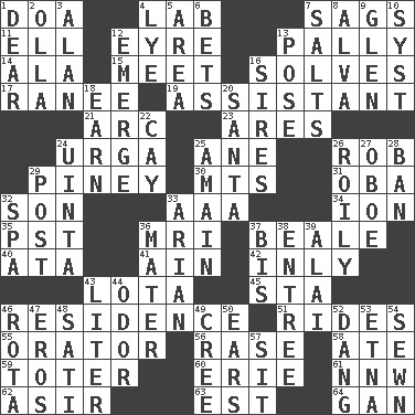ACROSS 1. ___ good deed 4. Experiment locale 7. Droops 11. Pipe bend 12. Jane of fiction 13. Friendly 14. Wing 15. Confront 16. Finds the solution 17. The wife of a rajah (variant) 19. Aide 21. Curve 23. Ancient Greek god of war 24. Capital and largest city of Mongolia 25. One (Scot) 26. Director Reiner 29. Abounding in pines 30. Mountains (abbr.) 31. Chief or king in Benin or Nigeria 32. Male offspring 33. Auto club (abbr.) 34. Electrically charged atom 35. Pacific Standard Time (abbr.) 36. Medical imaging device (abbr.) 37. Memphis, Tenn. Street 40. _ moment's notice (2 wds.) 41. The 18th letter of the Arabic alphabet 42. Inwardly 43. Globular water bottle used in Asia 45. R.R. building 46. Home 51. Amusement-park features 55. Speaker 56. Raze (variant) 58. Had dinner 59. Carrier 60. 4th largest of the Great Lakes 61. Compass dir. 62. SW Saudi Arabia district 63. Eastern Standard Time (abbr.) 64. Separate the seeds from cotton DOWN 1. Letter starter 2. Spanish pot 3. Actor Alda or Thicke 4. Sodium hydroxide 5. Length times width 6. Antes 7. Table seasonings 8. Inventor's middle name 9. Small, secluded valley 10. System (abbr.) 12. Develop 13. Airs 16. Male parents of animals 18. Merit 20. Before Barbara or Clara 22. Island 24. National forest in Provo, Utah 25. At full speed 26. Agitated, as a liquid 27. Mitch Miller's instrument 28. Bar 29. Mail 32. Health resort 33. Believer in; advocate of (suffix) 36. Mother 37. Again 38. Main course 39. Mountain range southwest of Kyrgyzstan 43. 61 cubic inches 44. Scent 46. Round or rotation of duties 47. Greek god of love 48. Suttee (variant) 49. Algonquian 50. Hearing organs 52. Mild oath, euphamism for damn 53. Inactive volcano in Sicily 54. Stitched 57. Be seated