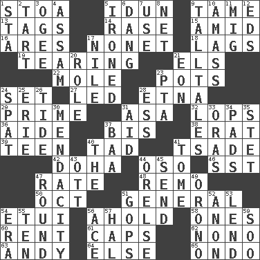 ACROSS 1. Portico 5. Goddess of spring and wife of Bragi 9. Not wild 13. Labels 14. Raze (variant) 15. Among 16. Ancient Greek god of war 17. Music written for nine 18. Straggles 19. Lacerating 21. Raised railways 22. Undercover agent 23. Plant holders 24. Arrange properly for use 27. Directed 28. Inactive volcano in Sicily 29. First class 31. White ___ sheet 32. Chops off 36. Helper 37. Altar cloth linen 38. Part of Q.E.F. 39. Adolescent 40. Small boy 41. Sadhe (variant) 42. Capital of the state of Qatar 44. Bear (Spanish) 46. Fast jet (abbr.) 47. Assign a rank or rating to 48. San ____ (Riviera town) 50. Sep. follower 51. Commissioned military rank 54. Needle case 56. Hold, grip (Informal) 58. Singles 60. Monthly bill 61. Smile enhancers 62. Words to Nanette 63. "60 Minutes" Commentator Rooney 64. Otherwise 65. Southwest Nigerian state DOWN 1. R.R. building 2. Small pie 3. Double curve, resembling the letter S 4. Indian state 5. Pressed 6. Mild oath, euphamism for damn 7. Purpose 8. Fish or hair follower 9. Baron Munchausen's specialties 10. Collect or gather 11. Russian fighter aircraft 12. Begley and Asner 17. The longest river in the world 20. Hero or heavy, e.g. 21. Age 23. Parent Teacher Assoc. 24. Argument over a trivial matter 25. 4th largest of the Great Lakes 26. Periodic rise and fall of the sea level 28. Curvy letter 30. Ananias' fault 31. Assist 33. Mouths or openings 34. Writing tablets 35. Proofreading order 37. Sound made by sheep 40. Definite Article 41. Heavy book 43. Baseball player Mel 44. Threatening words 45. Post 47. Having a circular shape 49. U. of Maine site 51. Republicans 52. Soon (poet.) 53. Grant temporary use of 54. Epoch 55. Nine, plus one 56. Adept person 57. Actor Linden 59. "Barney Miller" actor Jack