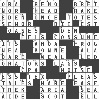 ACROSS 1. Mouth or opening 4. San ____ (Riviera town) 8. Cy Young winner Saberhagen 12. Not either 13. Froth on beer 14. Immoral or dissolute person 15. Genesis locale 17. At one time in the past 18. Hauls 19. Sir (Sp.) 21. Pass on 23. Eastern Standard Time (abbr.) 24. Fertile tracts in a desert 26. Lair 28. Snakelike fish 30. Ingest 34. ___ a Wonderful Life 37. Small Philippine buffalo 39. Toadlike animal 40. Teachers' org. 41. Maid-servant 43. In the manner of 44. Have the gumption 46. Welt 47. Directed 48. Speakers 51. Fails to keep up a pace 54. Tax preparer (abbr.) 55. Annoying sound 58. Double-curved letter 61. John Ritter's dad 63. Entreaties 65. Lies 67. Female horse 71. Relaxation 72. Long journey 73. Operatic vocal solo 74. Ocean 75. Helper 76. Native of Scotland 77. Pipe bend DOWN 1. Washington bills 2. Cowboy competition 3. Sports stadium 4. 17th letter of the Greek alphabet 5. Car or cant ending 6. Big _ 7. Wrote a lyric poem 8. Sis' sibling 9. Pace 10. Makes supply last 11. Trial 16. Sense of smell 18. Adolescent 20. To riddle 22. Wedding promise 25. Thick slice 27. Science/research agcy. 29. Overwhelms 30. Lessep's creation 31. Mountain range 32. Undercover agent 33. Mild oath 34. _ china 35. Pull apart 36. "Two Mules for Sister ____" 38. Single 42. Enthusiasm 45. And so on (abbr.) 49. Chooses 50. Actress Charlotte 52. Republican Party 53. Drop; flow; fall 56. Gospel singer Marvin 57. Artist's stand 58. Singer James 59. Indian skirt 60. Downhill vehicle 62. Dec. holiday 64. Lick closed 66. Supplement with great effort 68. Curve 69. River (Sp.) 70. Ingest