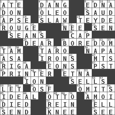 ACROSS 1. Had dinner 4. Mild oath, euphamism for damn 8. Pulitzer Prize-winning author Ferber 12. Spanish title 13. Butter sub 14. Saudi Arabian king (1953-1964) 15. Domed church section 17. Cole _ (cabbage dish) 18. Miss Universe 1986, Barbara Palacios _ 19. Makeup applied to the cheeks 21. Born 23. Elected rep. 24. Seines 26. Head covering 28. Letter starter 30. Mood resulting from idleness 34. Scottish cap 37. Edible starchy tuberous root 39. California wine valley 40. White ___ sheet 41. Metal shackles 43. Mountains (abbr.) 44. Port city in Latvia 46. Immeasurably long periods of time 47. Pacific Standard Time (abbr.) 48. Hard copy producer 51. Inactive volcano in Sicily 54. Electrically charged atom 55. Makes a sale 58. Allow 61. Order of Saint Francis (abbr.) 63. Leaves out 65. Standard of perfection 67. "Beetle Bailey" pooch 71. Mine, in Marseilles 72. Passed on 73. It's straight from the horse's mouth 74. Pipe bend 75. Transmit 76. Leg joint 77. Perceive with the eye DOWN 1. The sixth month of the Jewish calendar 2. Literary convention 3. Take place subsequently 4. Two (Sp.) 5. Everything 6. Teachers' org. 7. Bride's dress 8. Compass dir. 9. 24-hour periods 10. Unadorned 11. Arabian gulf 16. Mild oath 18. Separate forcefully 20. Compass dir. 22. Environmental prefix 25. Suttee (variant) 27. Fenced enclosure 29. More valued for its uncommonness 30. Maid-servant 31. Moist 32. Chooses 33. Vertical spar for supporting sails 34. Canvas cover 35. SW Saudi Arabia district 36. Wise men 38. Friend of Pooh 42. Fast planes 45. Cuckoo 49. Utensil 50. Followers of ems 52. Modern: prefix 53. _ mater 56. Citrus fruits 57. Took without asking 58. Flaplike coverings 59. Singer Brickell 60. Adolescent 62. Tined utensil 64. Filth; sediment 66. Find the sum of 68. Nine, plus one 69. Neckwear 70. Single