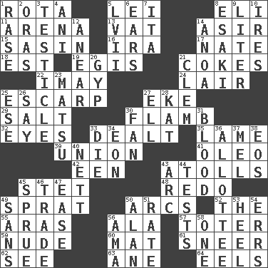 ACROSS 1. Roll call or roster of names 5. Flowery wreath 8. Biblical high priest 11. Sports stadium 13. Large container 14. SW Saudi Arabia district 15. Indian antelope 16. Lyricist Gershwin 17. Nathan's nickname 18. Eastern Standard Time (abbr.) 19. Armor plate that protects the chest 21. Popular sodas 22. "If ____ say so..." 24. Den 25. Fortification 27. Supplement with great effort 29. Table seasoning 30. Flambe (short form) 32. Snake ____ (dice throw) 33. Started a card game 35. Unable to walk 39. The state of being joined or united 41. Butter sub 42. Car or cant ending 43. Ringlike coral islands and reefs 45. Proofreading order 48. Make new 49. Small fatty European fish 50. Curves 52. Definite Article 55. Caspian sea tributary 56. According to 57. Carrier 59. Naked 60. Floor protector 61. Scornful expression 62. Perceive with the eye 63. A saturated hydrocarbon 64. Snakelike fish DOWN 1. Raze (variant) 2. Mouths or openings 3. One of the two male reproductive glands 4. Cuckoo 5. 57 in ancient Rome 6. Hearing organs 7. Call ___ day 8. 1973 Nobel Price Winner (Physics) Leo 9. 61 cubic inches 10. Angers 12. Approach 14. Small Philippine buffalo 20. Con 21. To starve (Brit.) 23. Taiwanese island in East China Sea 25. Compass dir. 26. Declare 27. Pipe bend 28. Krazy ___ of comics 30. Avid follower 31. Vital fluid 33. Pass on 34. Period of immesurable duration 36. One to whom something is allotted 37. Cartoonist voice _ Blanc 38. Greek goddess of the dawn 40. Remaining after all deductions 43. Curve 44. Trials 45. Disorder 46. Barter 47. Comfort 49. Without 50. Actor Alda or Thicke 51. Assign a rank or rating to 53. The bottom of a shoe or boot 54. Blunders 56. Housemaid (var.) 58. Single