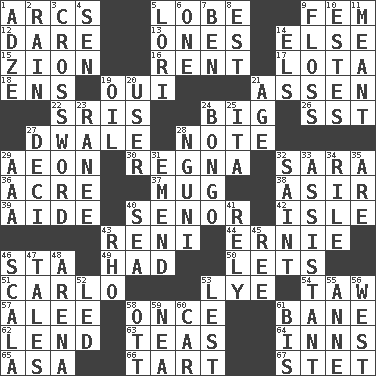 ACROSS 1. Arches 5. Ear part 9. Opposite of masc. 12. Have the gumption 13. Singles 14. Otherwise 15. The Jewish people; Israel 16. Monthly bill 17. Globular water bottle used in Asia 18. Followers of ems 19. Fr. "Yes" 21. NE Netherlands city 22. Indian titles of respect 24. Massive 26. Fast jet (abbr.) 27. A sleeping potion; an opiate (poet.) 28. Musical sound 29. A really long time 30. Canadian anthropologist Darnell 32. "Two Mules for Sister ____" 36. Measure of real estate 37. Java container 38. SW Saudi Arabia district 39. Assistant 40. Sir (Sp.) 42. Capri or Wright 43. Painter Guido (1575-1642) 44. Bert's buddy 46. R.R. building 49. Possessed 50. Allows 51. Monte _, Las Vegas Hotel/Casino 53. Potassium hydroxide 54. The 23rd letter of the Hebrew alphabet 57. Toward shelter 58. At one time in the past 61. Object of repulsion 62. Grant temporary use of 63. Afternoon social gatherings 64. Lodging establishments 65. White ___ sheet 66. Small pie 67. Proofreading order DOWN 1. Axlike tool, used for shaping wood 2. Water falling in drops from the sky 3. What you're doing now 4. Elected rep. 5. Australian parrot (variant) 6. Single 7. Benjamin's nick name 8. Eastern Standard Time (abbr.) 9. Soft thread for cleaning between teeth 10. _____ Park, CO 11. Intended 14. Raised railways 19. Petroleum 20. One who makes use of a thing 21. Grow older 23. Indian princess (variant) 24. Beat drum 25. Call ___ day 27. Tenth: prefix 28. Group of southern Bantu languages 29. Auto club (abbr.) 31. Make improvements or corrections to 32. Inhabitant of Heaven 33. Aide 34. Cause heat under the collar 35. "We ___ not amused" (Victoria) 40. Ocean 41. Have trust in 43. 17th letter of the Greek alphabet 45. To separate or throw off 46. Any of the three canals of the cochlea 47. Stories 48. Sports stadium 52. Directed 53. For fear that 55. Queen of England 1702-14 56. Compass direction 58. Baseball player Mel 59. Teachers' org. 60. 4-wheeled motor vehicle 61. Twice