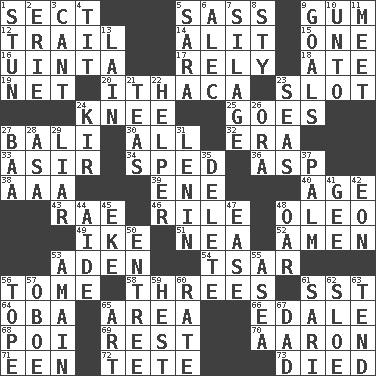 ACROSS 1. Religious group 5. Backtalk 9. Chewing product 12. Get behind 14. Came down and settled, as after flight 15. Single 16. National forest in Provo, Utah 17. Have confidence or faith in 18. Had dinner 19. Fish or hair follower 20. New York city 23. Notch 24. Leg joint 25. Travels 27. Indonesian resort city 30. 100% 32. Epoch 33. SW Saudi Arabia district 34. Broke a traffic law 36. Cleo's killer 38. Auto club (abbr.) 39. Compass dir. 40. Ripen 43. Actress Charlotte 46. Cause heat under the collar 48. Butter sub 49. Mamie's mate 51. Teachers' org. 52. So be it 53. Arabian gulf 54. Russian ruler of old 56. Heavy book 58. Trios 61. Fast jet (abbr.) 64. Chief or king in Benin or Nigeria 65. Type of rug 66. Peak District village in England 68. Luau course 69. Relief 70. Composer Copland 71. Car or cant ending 72. False hair 73. Passed on DOWN 1. Astound 2. One of the Great Lakes 3. Patter 4. Teat (slang) 5. "Two Mules for Sister ____" 6. Actor Baldwin 7. Fodder prepared in a silo 8. Filthy place 9. Scores awarded for successful feats 10. To (old English) 11. Rendezvous 13. (Had) reclined 21. Beverages made from leaves 22. Assistant 23. Oceans 24. Apertif with cassis 26. Mouth or opening 27. Sound made by sheep 28. White ___ sheet 29. One who doesn't tell the truth 31. Soviet premier 1918-24 35. Keyboard key 37. Inside of hand 41. Turn to the right 42. Period of immesurable duration 44. Helper 45. Supplement with great effort 47. Comfort 48. Rowing implement 50. Main course 53. With great haste 55. At sea 56. Drink excessively 57. Mitch Miller's instrument 59. Command 60. Pace 61. Indian skirt 62. A type of plum 63. Be inclined (to) 65. Nonscientific branch of learning 67. Male parent