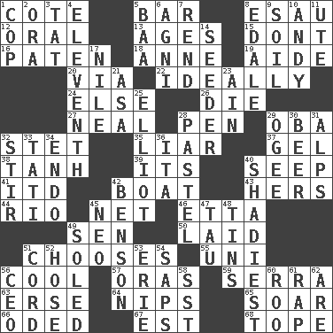 ACROSS 1. ____ d'Azur (French Riviera) 5. Oblong piece of solid material 8. He sold his birthright 12. Of the mouth 13. Eons 15. Do not 16. Eucharist need 18. Queen of England 1702-14 19. Assistant 20. By way of 22. Under perfect conditions 24. Otherwise 26. Pass on 27. Be tempered by heat 28. Animal enclosure 29. Chief or king in Benin or Nigeria 32. Proofreading order 35. One who doesn't tell the truth 37. Set 38. Hyperbolic tangent 39. It is 40. Ooze 41. It would 42. Water vessel 43. Possessive pronoun 44. _ de Janeiro 45. Fish or hair follower 46. Singer James 49. Elected rep. 50. Put down 51. Opts 55. Corn or form start 56. Calm and collected 57. Mouths or openings 59. Father Junipero _ 63. Celtic language 64. Cuts off 65. Fly high 66. Wrote a lyric poem 67. Eastern Standard Time (abbr.) 68. Drink excessively DOWN 1. Police officer (slang) 2. Mouth or opening 3. Make lace 4. Veterans Day date 5. Sound made by sheep 6. Hindu god of fire 7. Tear apart 8. Peak District village in England 9. Earth 10. Actor Griffith 11. Shoshoni 14. Sowing specialist 17. "Death on the ____" 21. White ___ sheet 23. The 18th letter of the Arabic alphabet 25. American author Paul (1891-1958) 28. Soft color 29. Double curve, resembling the letter S 30. Fermented drink made from hops 31. High mountains 32. Agitate 33. Jacques of French films 34. Inside; within (prefix) 36. Call ___ day 40. Most dubious of character or honesty 42. Gillaume's butler role 45. Modern: prefix 47. The 19th letter of the Greek alphabet 48. Canisters 49. Having a sole or soles 51. Drawstring 52. Stockings 53. One of the Great Lakes 54. Plant excrements 56. Corporate head (abbr.) 58. Fast jet (abbr.) 60. Friend of Pooh 61. Reproach for some lapse or misdeed 62. "We ___ not amused" (Victoria)