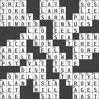 ACROSS 1. Indian titles of respect 5. Erode 8. Mayday 11. Puff or smoke 12. Cowardly lion portrayer 14. Untruth 15. Dark wood 17. "Two Mules for Sister ____" 18. Whimper 19. Looked after 21. Follows as a consequence or result 23. Lion 25. Snakelike fish 26. Broad, flat, thick piece 27. Ocean 28. Elected rep. 31. Frozen water 33. Director Reiner 35. Giggle 37. Type of rug 38. Snakelike fish 40. Old wives' tales, e.g. 41. Haggard of country music 43. At this time 45. Filthy place 46. Pacific Standard Time (abbr.) 47. Large container 50. Wig 52. Food container 53. White ___ sheet 54. Threatening words 56. TNT 61. Actor Alda or Thicke 62. At sea 65. Collection of objects 66. Allow 67. Place where flour is made 68. Grows older 69. Ripen 70. Be seated 71. Political cartoonist Thomas DOWN 1. Proofreading order 2. Loose flowing garment 3. Visual representation of an object 4. Transmit 5. Raised railways 6. American Automobile Association (abbr.) 7. Triplets 8. Turn sharply 9. Petroleums 10. Observe 13. Indian princess (variant) 16. Shout 18. Ichor 20. Letter starter 22. Narrow board 24. Mitch Miller's instrument 26. Lick closed 28. Went for two points 29. Suggestive of the supernatural 30. Born 31. Angers 32. Certainty 34. Benjamin's nick name 36. Otherwise 37. Electrical Unit 39. Globular water bottle used in Asia 42. Tending to cause great harm 44. 270 degrees 48. Indian state 49. College paper 51. Small pie 52. Lair 54. Cassini of fashion 55. Assign a rank or rating to 57. Northwest Algerian city 58. Ancient Roman robe 59. Jacques Cousteau's middle name 60. For fear that 61. Chicken ___ king 63. Connecticut Ivy Leaguer 64. The first octave above the treble staff