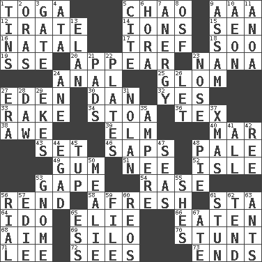 ACROSS 1. Ancient Roman robe 5. US Secretary of Labor Elaine L. _ 9. Auto club (abbr.) 12. Feeling or showing extreme anger 14. Charged particles 15. Elected rep. 16. Relating to or accompanying birth 17. Not kosher 18. "Barney Miller" actor Jack 19. Compass dir. 20. Seem 23. Grandmother 24. Of or related to the anus 25. Seize upon or latch onto something 27. Locale of original sin 30. Daniel's nick name 32. Consenting reply 33. Libertine 34. Portico 36. John Ritter's dad 38. Deep reverence 39. Shade tree 40. Impair 43. Arrange properly for use 46. Plant excrements 48. Diluted with white 49. Chewing product 51. Born 52. Small island 53. Yawn 54. To erase 56. Tear apart 58. Anew 61. R.R. building 64. Wedding promise 65. Writer Wiesel 66. Eroded 68. Direct toward a target or goal 69. Grain storage tower 70. Difficult or unusual or dangerous feat 71. Area sheltered from the wind 72. Perceives with the eye 73. Extremities DOWN 1. Airtight sealed metal containers 2. Mouths or openings 3. Yard entry 4. "One Day ___ Time" 5. Quote 6. Israeli folk dance 7. Disorder of the immune system 8. Order of Saint Francis (abbr.) 9. Indian state 10. Age 11. Small Philippine buffalo 13. Enthusiasm 21. Writing tablets 22. Food holders 23. Characteristic smell of wine 24. A saturated hydrocarbon 26. Allow 27. Epoch 28. Fool 29. Makes supply last 31. Pitcher Ryan 35. Electrical Unit 37. Dec. holiday 41. 100% 42. To riddle 44. Mild oath 45. Uncastrated adult male sheep 47. Oceans 48. Sliced dessert 50. Ear of corn 53. Dwarf 55. "______ My Girl" (Turtles hit) 56. Monetary unit of Yemen 57. Singer Brickell 59. Do some clerical work 60. Vintage cars 61. Surprise greatly 62. Watch over 63. Pismires 65. Double-curved letter 67. Had dinner