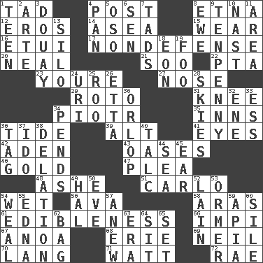 ACROSS 1. Small boy 4. Mail 8. Inactive volcano in Sicily 12. Greek god of love 14. Toward the sea 15. Put on (as clothing) 16. Needle holder 17. Unrelated to defense, as in spending 20. Be tempered by heat 21. "Barney Miller" actor Jack 22. Parent Teacher Assoc. 23. You are 27. Olfactory organ 29. Printing process, for short 31. Leg joint 34. Peter (Polish) 35. Restaurants 36. Event that recurs at intervals 39. Keyboard modifier key 41. Sight organs 42. An important port of Yemen 43. Fertile tracts in a desert 46. Gilded 47. Entreaty 48. American tennis player Robert 51. Monte _, Las Vegas Hotel/Casino 54. Dripping 56. Actress Gardner 58. Ancient river in northeast Turkey 61. The property of being fit to eat 66. Body of Kaffir warriors 67. Small Philippine buffalo 68. One of the Great Lakes 69. Famous astronaut Armstrong 70. Austrian-born American filmmaker Fritz 71. Electrical Unit 72. Actress Charlotte DOWN 1. Adolescent 2. Johnson of "Laugh-In" 3. A city in N France, SE of Calais 4. Baking dish 5. Bear (Spanish) 6. Elected rep. 7. Bits 8. She-sheep 9. 3-inch nail 10. Political cartoonist Thomas 11. Type of rug 13. Grain storage tower 18. Age 19. Egg _ yung 24. RI univ. 25. Friend of Pooh 26. Singer James 28. Atmospheres 30. Fourth or lowest deck 32. Compass dir. 33. Curvy letter 34. Hangs 36. Label 37. Wedding promise 38. Accusation by an informer 40. Baby powder 44. Ocean 45. Ewer handle 49. Actor Linden 50. Night before a holiday 52. (Had) reclined 53. Channel Islands abalone 54. Welt 55. Pulitzer Prize-winning author Ferber 57. Afresh 59. Capital of Western Samoa 60. Drop; flow; fall 62. Container for groceries 63. Epoch 64. Be seated 65. Arrange properly for use