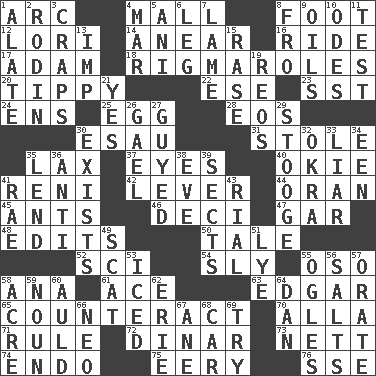 ACROSS 1. Curve 4. Promenade 8. Lowest support of a structure 12. Australian parrot (variant) 14. Approach 16. Travel on an animal 17. First man 18. Complicated, petty procedures 20. Likely to tip or tilt 22. Compass dir. 23. Fast jet (abbr.) 24. Followers of ems 25. Ovum 28. Greek goddess of the dawn 30. Son of Isaac 31. Fur scarf 35. Not strict 37. Snake ____ (dice throw) 40. Migrant worker of the '30s 41. Painter Guido (1575-1642) 42. Crowbar 44. NW Algerian seaport 45. Pismires 46. Tenth: prefix 47. Slender fish 48. Proofreads 50. Lie 52. _-fi 54. Insidious 55. Bear (Spanish) 58. Santa ___, CA 61. Adept person 63. _ Allan Poe 65. Neutralize 70. Silent film actress Nazimova 71. General guideline 72. Middle Eastern gold or silver currency 73. Remaining after all deductions 74. Inside; within (prefix) 75. Suggestive of the supernatural 76. Compass dir. DOWN 1. Having winglike extensions 2. "The Thinker" sculptor 3. Dice game 4. Third mo. 5. Black tropical American cuckoo 6. Part of a journey 7. Unable to walk 8. Back 9. Petroleums 10. Lyric poems 11. Trial 13. Mischievous child 15. To erase 19. Vintage cars 21. Affirmative reply 26. Highlander 27. Mocked 29. Moe Howard, for one 30. Has an existence 32. Gumbo ingredient 33. One who doesn't tell the truth 34. Car or cant ending 35. Grant temporary use of 36. Against 38. Night before a holiday 39. Religious groups 41. Actress Charlotte 43. Monetary unit of Yemen 49. Scram! 51. Potassium hydroxide 53. On the rocks 55. Stares 56. Table seasonings 57. Speak pompously 58. Measure of real estate 59. Part of speech 60. Old (Scot.) 62. 4th largest of the Great Lakes 64. Daniel's nick name 66. Modern: prefix 67. A saturated hydrocarbon 68. 4-wheeled motor vehicle 69. Attempt to accomplish something