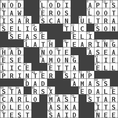 ACROSS 1. Allow head to fall sleepily 4. Farming town in central California 8. Flats, for short 12. The 23rd letter of the Hebrew alphabet 13. Greek god of love 14. Spoils 15. Austrian river, tributary to the Danube 17. Examine hastily 18. Extreme 19. Former Milwaukee Brewers owner Bud 21. Affectionate concern, for short 23. Male child 24. Gospel singer Marvin 26. Biblical high priest 28. Thin strip of wood or metal 30. Pulling into pieces 34. Possessed 37. Musical sound 39. At sea 40. Compass dir. 41. Amid 43. Whopper 44. Louse (plural) 46. Singer James 47. Pipe bend 48. Hard copy producer 51. Simple or foolish person 54. Male parent 55. Collect or gather 58. R.R. building 61. Acura sports coupe 63. Peak District village in England 65. Monte _, Las Vegas Hotel/Casino 67. Vertical spar for supporting sails 71. Play the lead 72. Butter sub 73. "____ silly question..." 74. It is 75. Trial 76. Alleged 77. Born DOWN 1. Nuclear Threat Initiatives 2. Fertile tracts in a desert 3. A sleeping potion; an opiate (poet.) 4. French article 5. The grampus (Milton) 6. ___ good deed 7. Is not 8. 100% 9. Cooking vessels 10. "Corrida" creature 11. Comedian Laurel of Laurel & Hardy 16. Monetary unit of Yemen 18. Southern CA. univ. 20. Girls' org. (abbr.) 22. Area sheltered from the wind 25. Inactive volcano in Sicily 27. Lyricist Gershwin 29. Simpsons dad 30. Portable shelters 31. Capri or Wright 32. Famous astronaut Armstrong 33. Highlander 34. Assist 35. SW Saudi Arabia district 36. Tenth: prefix 38. Small child 42. Greek goddess of the earth (variant) 45. Conclude 49. Pacific island yam 50. Begley and Asner 52. Madame (abbr.) 53. Writing tablets 56. Smooth fabric 57. Chalkboard 58. Highlander 59. Story 60. Ancient Greek god of war 62. Dec. holiday 64. Celtic language 66. Car dealer's back yard 68. White ___ sheet 69. What Jean-Claude Killy likes to do 70. Small amount or degree
