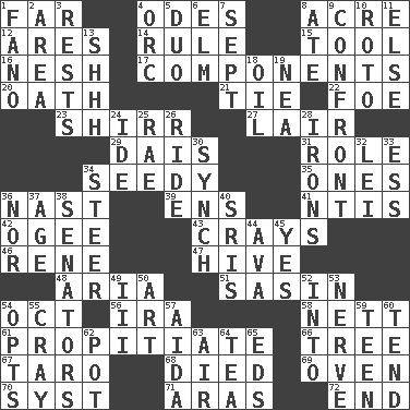 ACROSS 1. At a great distance 4. Lyric poems 8. 1/640 square mile 12. Ancient Greek god of war 14. Governing power 15. Instrument 16. Soft 17. Parts 20. Pledge 21. Make a knot 22. Enemy 23. Bake eggs in their shells 27. Den 29. Raised platform 31. Hero or heavy, e.g. 34. Full of seeds 35. Singles 36. Political cartoonist Thomas 39. Followers of ems 41. Nuclear Threat Initiatives 42. Double curve, resembling the letter S 43. Trading vessels 46. French philosopher Descartes 47. Hub of activity 48. Roberta Peters solo 51. Indian antelope 54. Sep. follower 56. Retirement account (abbr.) 58. Remaining after all deductions 61. Conciliate 66. Relationship diagram 67. Edible starchy tuberous root 68. Passed on 69. Baking chamber 70. System (abbr.) 71. Caspian sea tributary 72. Conclusion DOWN 1. Papal veil 2. Length times width 3. Musical pauses 4. The grampus (Milton) 5. Superhero pair 6. Shade tree 7. Back-to-school mo. 8. Had dinner 9. Meet 10. Printing process, for short 11. Otherwise 13. Quiet! 18. Petroleum 19. Teachers' org. 24. Binary compound 25. Actress Charlotte 26. Travel on or in a vehicle 28. Metal shackles 30. Synchronize (abbr.) 32. Luau accessory 33. Curvy letter 34. Guide 36. And not 37. Grow older 38. Elected representatives 40. Indian titles of respect 44. Actress Gardner 45. Affirmative reply 49. One more than two 50. Tate display 52. To the inside or interior of 53. Impudent aggressiveness 54. Elects 55. Supercomputer manufacturer 57. Opera by Verdi 59. Adolescent 60. Look after 62. Plant holder 63. Atmosphere 64. Beverage made from leaves 65. Begley and Asner
