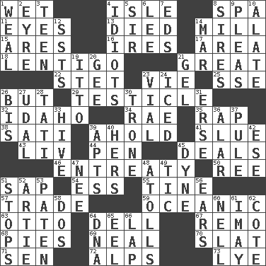 ACROSS 1. Dripping 4. Small island 8. Health resort 11. Snake ____ (dice throw) 13. Passed on 14. Place where flour is made 15. Ancient Greek god of war 16. Angers 17. Type of rug 18. Small, flat, pigmented spot on the skin 21. Relatively large 22. Proofreading order 23. Compete 25. Compass dir. 26. Yet 29. One of the two male reproductive glands 32. Potato state 34. Actress Charlotte 35. Strike 38. Suttee (variant) 39. Hold, grip (Informal) 41. Turn sharply 43. 54 in ancient Rome 44. Fenced enclosure 45. Allots cards 46. Plea 50. Portuguese money of account (variant) 51. Plant excrement 54. Double-curved letter 55. Prong on a fork 57. Buy and sell 59. Pertaining to the sea 63. "Beetle Bailey" pooch 64. Small valley 67. San ____ (Riviera town) 68. Sliced desserts 69. Anneal 70. Narrow board 71. Elected rep. 72. High mountains 73. Sodium hydroxide DOWN 1. Welt 2. Jane of fiction 3. Adolescent 4. Foolish or stupid persons 5. Title for a knight 6. Area sheltered from the wind 7. Begley and Asner 8. Fathers 9. Entreaties 10. Having winglike extensions 12. Fast planes 14. Spoil 19. "Tell ____ the Marines!" 20. Unit of force equal to gravity 21. Set 23. Small bottle 24. On the rocks 26. Altar cloth linen 27. Freehold land 28. Jacques of French films 30. Marketplace scale 31. Celtic language 33. Hub of activity 36. Having or resembling wings 37. Whine 39. Flats, for short 40. Possessive pronoun 42. Compass dir. 45. Unit of force 47. Born 48. Ringlike coral islands and reefs 49. Nervous spasm 51. Discontinues 52. Nick name for Arthur 53. Eucharist need 56. Hearing organs 58. Two (Sp.) 60. 1994 drama film starring Jodie Foster 61. "If ____ say so..." 62. ____ d'Azur (French Riviera) 64. Heredity factor (abbr.) 65. Snakelike fish 66. Pet locale