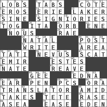 ACROSS 1. Tennis shots 5. Bar bills 9. ____ d'Azur (French Riviera) 13. Greek god of love 14. One of the Great Lakes 15. Member of a famous L.A. basketball team 16. Trig term 17. Seigniories (variant) 19. Coat; cloak 20. Call ___ day 21. Globe 22. Compass dir. 23. Good sense 25. Actress Charlotte 26. Relating to or accompanying birth 30. Mail 34. Compose 35. Length times width 36. Jacques of French films 39. Congenital growth or mark on the skin 42. Leave at once 43. Independent ruler or chieftain 44. _____ Park, CO 46. Nathan's nickname 47. Break or tear apart 48. Turn to the right 51. Pulitzer Prize-winning author Ferber 54. Ewer handle 57. Animal enclosure 58. Personal Computers (abbr.) 60. Mouth or opening 62. Interpreter 65. Among 66. Proceeds 67. Wig 68. To erase 69. At sea 70. Relaxation 71. Paradise DOWN 1. For fear that 2. Greek mythologigal hunter 3. Beat drum 4. Compass dir. 5. Trial 6. Roberta Peters solo 7. Massive 8. Sir (Sp.) 9. 4-wheeled motor vehicle 10. Migrant worker of the '30s 11. Adolescent 12. Celtic language 15. Ear part 18. Retirement account (abbr.) 20. Austrian river, tributary to the Danube 24. Undo the wiring of 27. Metal container 28. Had dinner 29. Crowbar 30. Went by 31. The grampus (Milton) 32. Ocean 33. Make lace 36. Nine, plus one 37. Nursemaid (var.) 38. Teat (slang) 40. Purpose 41. R.R. building 45. Nights before holidays 48. Global Positioning Systems (abbr.) 49. Snakelike fish 50. Maternal 52. Wanderer 53. Ascend 54. Singer James 55. Ancient river in northeast Turkey 56. Libertine 58. Plant holders 59. Algonquian 61. An important port of Yemen 63. Teachers' org. 64. Beverage made from leaves 65. "We ___ not amused" (Victoria)