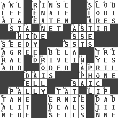 ACROSS 1. Leather borer 4. Remove soap 9. Oscar Madison type 13. Area sheltered from the wind 14. Related on the mother's side 15. Farming town in central California 16. "One Day ___ Time" 17. Ingested 18. Ancient Greek god of war 19. R.R. building 21. Fish or hair follower 22. Having gotten out of bed 24. Flintstone garb 26. Compass dir. 27. Full of seeds 29. Fast planes 30. Match 31. Actor Lugosi 33. Three (prefix) 36. Actress Charlotte 37. Popular '50s hangout 40. Consenting reply 41. Find the sum of 42. Wrote a lyric poem 43. Showery time 45. Raised platform 47. Give a jingle 48. Pipe bend 49. Ketch in the Levant 50. Chummy 52. Make lace 54. Mouth edge 56. Not wild 57. Bert's buddy 59. June honoree 61. Came down and settled, as after flight 62. Allots cards 63. One more than two 64. Ancient Persian 65. Makes a sale 66. Compass dir. DOWN 1. Chicken ___ king 2. Moistens 3. Resembling or made to resemble leather 4. Portuguese money of account (variant) 5. Empty; void 6. Nathan's nickname 7. Proofreading order 8. Car or cant ending 9. Chalkboards 10. Australian parrot (variant) 11. Baltic tributary 12. Twice 20. Helper 22. Slender Brazilian palm 23. Fast jet (abbr.) 25. Colored 27. "Two Mules for Sister ____" 28. Mild oath 29. Downhill vehicle 31. Auction offers 32. First lady 33. Polypeptide antibiotic 34. It's straight from the horse's mouth 35. Capri or Wright 38. Turbulent 39. California wine valley 44. Silvers or Donahue 45. Erase 46. 100% 49. Free of sound 50. Diluted with white 51. Among 52. Relationship diagram 53. Of or related to the anus 55. Ache 56. Scottish cap 57. Begley and Asner 58. Curvy letter 60. Expire