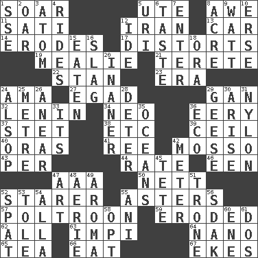 ACROSS 1. Fly high 5. Shoshoni 8. Deep reverence 11. Suttee (variant) 12. SW Asia republic 13. 4-wheeled motor vehicle 14. Eats (away) 17. What propaganda does 19. Ear of corn 21. Cigar-shaped 22. Comedian Laurel of Laurel & Hardy 23. Epoch 24. Housemaid (var.) 27. Mild oath 29. Separate the seeds from cotton 32. Soviet premier 1918-24 34. Modern: prefix 36. Suggestive of the supernatural 37. Proofreading order 38. And so on (abbr.) 39. To provide with a ceiling 40. Mouths or openings 41. To separate or throw off 42. With motion or animation 43. For each 44. Assign a rank or rating to 46. Car or cant ending 47. Auto club (abbr.) 50. Remaining after all deductions 52. A viewer who gazes fixedly 55. Michaelmas daisies 57. Coward 59. Worn away 62. 100% 63. Body of Kaffir warriors 64. Billionth: prefix 65. Afternoon social gathering 66. Ingest 67. Supplements with great effort DOWN 1. Compass dir. 2. Rowing implement 3. Tiny particle 4. Amusement-park features 5. RI univ. 6. Clothes sense 7. Keyboard key 8. Land measure 9. Electrical Unit 10. Celtic language 12. Binary compound 15. Consumed 16. Volcanic refuse 18. Mouth or opening 20. More empty; more void 24. Columnist Joseph or Stewart 25. Distance measurement (Brit.) 26. Approach 28. Prevent from occurring 29. Honkers 30. Get up 31. High-strength synthetic material 33. It is 35. Seas 36. Environmental prefix 42. Distance measurement 45. False hair 47. Tate display 48. Nest on high 49. Scent 51. Heavy duty weighing machine 52. Petty quarrel 53. Lacquered or enameled metalware 54. Silent film actress Nazimova 55. Cuckoo 56. Neighbor of Neb. 58. Choose 60. Compass dir. 61. Two (Sp.)