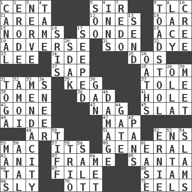 ACROSS 1. Penny 5. Title for a knight 8. Affectionate concern, for short 11. Length times width 12. Washington bills 14. Boat paddle 15. Typical models 17. Something which is sent 18. Adept person 19. Contrary to your interests or welfare 21. Male offspring 22. Color 23. Area sheltered from the wind 24. Binary compound 25. Two (Sp.) 27. Plant excrement 28. Smallest unit of an element 31. Scottish caps 35. Cask 37. Lacquered or enameled metalware 38. Presage 39. June honoree 41. Opening into or through something 42. Went 43. Tired old horse 45. Narrow board 46. Helper 47. Atlas unit 49. Nonscientific branch of learning 51. _ moment's notice (2 wds.) 52. Followers of ems 55. Apple computer (short form) 57. It is 60. Commissioned military rank 62. Cuckoo 63. Movie unit 65. Before Barbara or Clara 66. Make lace 67. Do some clerical work 68. Thailand, formerly 69. Wily 70. Baseball player Mel 71. Snakelike fish DOWN 1. Lessep's creation 2. Wear away 3. Boldness 4. Not wild 5. "Barney Miller" actor Jack 6. Lodging establishments 7. Make new 8. Inedible or poisonous agaric 9. Made of lace 10. Algonquian 13. Post 16. Indian titles of respect 17. Oozed 20. Neighbor of Neb. 26. Profane or obscene expressions 29. Water jar 30. Rendezvous 31. Ancient Roman robe 32. Mine, in Marseilles 33. Ananias' fault 34. Scornful expression 36. Separate the seeds from cotton 40. Break 44. Yard entry 48. Zero-star reviews 50. Small quarrel 52. Bert's buddy 53. Brizilian seaport 54. Hits or strikes with great force 55. Floor coverings 56. Of or related to the anus 58. Musical group of three 59. Table seasoning 61. Relaxation 64. Was introduced to