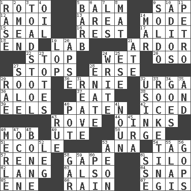 ACROSS 1. Printing process, for short 5. Lip ointment 9. Plant excrement 12. Mine, in Marseilles 13. Length times width 14. Method 15. Lick closed 16. Remainder 17. Came down and settled, as after flight 18. Conclusion 19. Experiment locale 21. Zeal 22. Close up, plug up 24. Soggy 26. Bear (Spanish) 27. Closes up, plugs up 28. Celtic language 29. Carrot, for example 30. Bert's buddy 32. Capital and largest city of Mongolia 36. _ vera 37. Erode 38. Within a short period 39. Snakelike fish 40. Eucharist need 42. On the rocks 43. Be footloose 44. Pig sounds 46. Disorderly crowd 49. Shoshoni 50. Goad 51. Learning spot: Fr. 53. Santa ___, CA 54. Label 57. French philosopher Descartes 58. Yawn 61. Grain storage tower 62. Long (Scottish) 63. In addition 64. Fastener 65. Compass dir. 66. Water falling in drops from the sky 67. The front part of a cuirass DOWN 1. Raze (variant) 2. Sign of things to come 3. Inedible or poisonous agaric 4. Petroleum 5. Sharp remark 6. "We ___ not amused" (Victoria) 7. French article 8. Floor protector 9. Twentieth part of a lira 10. Goodbye (Sp.) 11. Stone: prefix 14. Impair 19. Chop off 20. Domed church section 21. Had dinner 23. Lugs 24. Compose 25. Compass dir. 27. Flatfish 28. Maternal 29. Actress Charlotte 31. Rob, plunder, or pillage 32. Putting into practice 33. Shooting up abruptly 34. Leaves 35. Also 40. Plant holder 41. Part of speech 43. Sorrow 45. Lyricist Gershwin 46. Haggard of country music 47. Sea 48. Maid-servant 52. Part of a journey 53. Period of immesurable duration 55. Jai _ 56. Republicans 58. Slender fish 59. Insect wing 60. Air pressure measure (abbr.) 61. Compass dir.