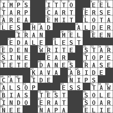 ACROSS 1. Naughty children 5. "Tell ____ the Marines!" 9. Snakelike fish 12. Canvas cover 13. Draw slowly or heavily 14. Celtic language 15. Length times width 16. Send forth 17. Globular water bottle used in Asia 18. French article 19. Possessed 21. Tree or shrub in the Birch family 22. SW Asia republic 24. Cartoonist voice _ Blanc 26. Car or cant ending 27. Peak District village in England 28. For fear that 29. Locale of original sin 30. Compose 32. Play the lead 36. Trig term 37. Hearing organ 38. Drink excessively 39. False hair 40. Natives or inhabitants of Denmark 42. Raze (variant) 43. Polynesian shrub of the pepper family 44. Remain 46. Feline 49. Binary compound 50. Pinches, bites 51. Columnist Joseph or Stewart 53. Double-curved letter 54. The 23rd letter of the Hebrew alphabet 57. Prejudice 58. Trial 61. Not divided or shared with others 62. _ china 63. Part of Q.E.F. 64. Fly high 65. Born 66. California wine valley 67. Writer Wiesel DOWN 1. Slanted text style (abbr.) 2. Female horse 3. Elected leader of a country 4. Health resort 5. On the rocks 6. Scottish cap 7. Three (prefix) 8. Baseball player Mel 9. Eat (away) 10. First name in cosmetics 11. Memorize 14. Pipe bend 19. Actor Linden 20. Afresh 21. The first octave above the treble staff 23. Indian princess (variant) 24. Distance measurement (Brit.) 25. Compass dir. 27. Singer Brickell 28. Woody, climbing, usually tropical plant 29. Eastern Standard Time (abbr.) 31. Break or tear apart 32. Long narrow piece of something 33. Inedible or poisonous agaric 34. Domed church section 35. To riddle 40. Male parent 41. Without 43. Sleep 45. Again 46. Small house or cottage 47. Place in a line 48. Sadhe (variant) 52. Bear (Spanish) 53. Singer James 55. Jai _ 56. We are 58. Nine, plus one 59. Period 60. Plant excrement 61. Compass dir.