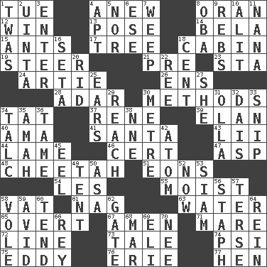 ACROSS 1. Third day of the wk. 4. Afresh 8. Northwest Algerian city 12. Acquire through effort 13. Introduce or present, as a question 14. Actor Lugosi 15. Pismires 17. Relationship diagram 18. Small house or cottage 19. Navigate 21. Before (prefix) 23. R.R. building 24. Nick name for Arthur 26. Followers of ems 28. The sixth month of the Jewish calendar 30. Modes 34. Make lace 37. French philosopher Descartes 39. Liveliness 40. Nanny (var.) 41. Before Barbara or Clara 43. Cards in a Roman deck? 44. Unable to walk 46. Foregone conclusion 47. Cleo's killer 48. Leopard's kin 51. Immeasurably long periods of time 54. French article 55. Wet 58. Large container 61. Tired old horse 63. Wetness 65. Unconcealed 67. So be it 71. Female horse 72. Actor's bit 73. Story 74. Air pressure measure (abbr.) 75. Whirlpool 76. 4th largest of the Great Lakes 77. Layer DOWN 1. It was, poetically 2. National forest in Provo, Utah 3. Keyboard key 4. Fitting 5. And not 6. Compass dir. 7. Shed a tear 8. Chief or king in Benin or Nigeria 9. Confederate soldiers (slang) 10. Came down and settled, as after flight 11. Grandmother 16. Bristle 18. Penny 20. To free from 22. Portuguese money of account (variant) 25. Hearing organs 27. A female animal or person 29. Arrive at 30. Distance measurement (Brit.) 31. Spanish pot 32. Raised platform 33. Clip 34. Baby powder 35. Wet nurse 36. Not wild 38. Compass dir. 42. Tiny particle 45. Snakelike fish 49. Portable shelter 50. White ___ sheet 52. At this time 53. Thailand, formerly 56. Staphylococcus 57. Laconic 58. Grand slam 59. Enthusiastic 60. Look after 62. Yard entry 64. It's straight from the horse's mouth 66. Marina Del _, California 68. Spoil 69. Biblical high priest 70. Born