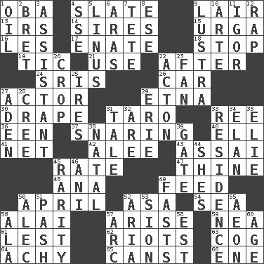 ACROSS 1. Chief or king in Benin or Nigeria 4. Chalkboard 9. Den 13. Big collection agency 14. Titles for men of rank and authority 15. Capital and largest city of Mongolia 16. French article 17. Related on the mother's side 18. Discontinue 19. Nervous spasm 21. Purpose 22. Following 24. Indian titles of respect 26. 4-wheeled motor vehicle 27. Thespian 29. Inactive volcano in Sicily 30. Window treatment 31. Edible starchy tuberous root 33. To riddle 36. Car or cant ending 37. Catching in a trap 40. Pipe bend 41. Fish or hair follower 42. Toward shelter 43. Slender Brazilian palm 45. Assign a rank or rating to 47. One or ones belonging to thee 48. Santa ___, CA 49. Nourish 50. Showery time 52. White ___ sheet 54. Ocean 56. Jai ____ 57. Originate 59. Teachers' org. 61. For fear that 62. Debaucheries 63. Gear tooth 64. Painful 65. 2nd pers. sing. pres. of can (arch.) 66. Compass dir. DOWN 1. Petroleum 2. Cy Young winner Saberhagen 3. Aide 4. Compass dir. 5. "_ and Lucy" (Charlie Brown theme song) 6. Caspian sea tributary 7. False hair 8. Compass dir. 9. A period of five years 10. Johnson of "Laugh-In" 11. Russian composer Stravinsky 12. Strike 20. Riding implement 22. Gambison 23. Air blower 25. Angers 27. An important port of Yemen 28. Algonquian 29. One of the Great Lakes 31. Story 32. "We ___ not amused" (Victoria) 33. Home 34. Style 35. Writer Wiesel 38. Brizilian seaport 39. Yard entry 44. "______ My Girl" (Turtles hit) 45. Noteworthy scarcity 46. Cuckoo 49. Goes without food and/or water 50. Actor Baldwin 51. Romantic infatuation 52. Operatic vocal solo 53. The Jewish people; Israel 55. Age 56. Wing 57. Curve 58. Eastern Standard Time (abbr.) 60. Ripen