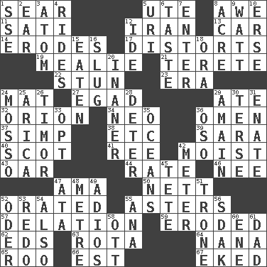 ACROSS 1. Scorch 5. Shoshoni 8. Deep reverence 11. Suttee (variant) 12. SW Asia republic 13. Automobile 14. Eats (away) 17. What propaganda does 19. Ear of corn 21. Cylindrical with tapered ends 22. Astound 23. Period 24. Floor covering 27. Mild oath 29. Had dinner 32. Constellation of myth 34. Modern: prefix 36. Presage 37. Simple or foolish person 38. And so on (abbr.) 39. "Two Mules for Sister ____" 40. Native of Scotland 41. To sift 42. Wet 43. Boat paddle 44. Assign a rank or rating to 46. Born 47. Nursemaid (var.) 50. Remaining after all deductions 52. Declaimed 55. Michaelmas daisies 57. Accusation by an informer 59. Worn away 62. Begley and Asner 63. Round or rotation of duties 64. Nanny 65. Friend of Pooh 66. Eastern Standard Time (abbr.) 67. Made supply last DOWN 1. Compass dir. 2. Ewer handle 3. Tiny particle 4. Amusement-park features 5. RI univ. 6. Clothes sense 7. Keyboard key 8. 43,560 square feet 9. Electrical Unit 10. Celtic language 12. Binary compound 15. Consumed 16. Snaillike creature with no shell 18. Mouth or opening 20. More empty; more void 24. With motion or animation 25. N. Chile seaport 26. The easternmost of the Lesser Sundas 28. Prevent from occurring 29. At full speed 30. Laconic 31. Related on the mother's side 33. Elect 35. Seas 36. Bear (Spanish) 42. Distance measurement 45. False hair 47. "One Day ___ Time" 48. Distance measurement (Brit.) 49. Goodbye (Sp.) 51. Heavy duty weighing machine 52. Baltic tributary 53. Do over again 54. In addition 55. Santa ___, CA 56. Neighbor of Neb. 58. Baseball player Mel 60. Compass dir. 61. Male parent