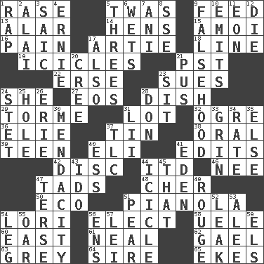 ACROSS 1. To erase 5. It was, poetically 9. Nourish 13. Having or resembling wings 14. Coop moms 15. Mine, in Marseilles 16. Ache 17. Nick name for Arthur 18. Actor's bit 19. Winter's stalactites 21. Pacific Standard Time (abbr.) 22. Celtic language 23. Institutes legal proceedings 24. A female animal or person 27. Greek goddess of the dawn 28. Food container 29. Singer Mel 31. Car dealer's back yard 32. Legendary monster 36. Writer Wiesel 37. Shallow baking pan 38. Spoken 39. Adolescent 40. Connecticut Ivy Leaguer 41. Proofreads 42. Flat circle 44. It would 46. Born 47. Small amounts or degrees 48. "Mermaids" star 50. Environmental prefix 51. Player piano 54. Australian parrot (variant) 56. Choose 58. Ubangi River tributary 60. 90 degrees 61. Actress Patricia 62. Highlander 63. Jennifer or Joel 64. Beget 65. Supplements with great effort DOWN 1. Strike 2. Mountain range southwest of Kyrgyzstan 3. Ketch in the Levant 4. Bert's buddy 5. Trios 6. Soaks 7. Black tropical American cuckoo 8. Compass dir. 9. It jiggles the polygraph 10. Gives off 11. Period of immesurable duration 12. Pass on 17. In addition 20. Algonquian 21. Ichor 23. Be seated 24. Proofreading order 25. Hollow 26. One of the Great Lakes 28. Spanish title 30. Ananias' fault 31. Cards in a Roman deck? 33. Smile widely 34. Assign a rank or rating to 35. Otherwise 37. Affectionate concern, for short 40. Curvy letter 41. Locale of original sin 43. Wedding promise 44. Ice on the eave 45. Not this but _ 47. Laconic 49. Makeup applied to the cheeks 51. Lightbulb-shaped fruit 52. Path through which fluid escapes 53. Toward shelter 54. Part of a journey 55. Rowing implement 56. Followers of ems 57. Flowery wreath 59. Raised railways