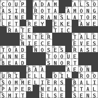 ACROSS 1. Overturn; upset 5. First of billions? 9. In addition 13. SW Saudi Arabia district 14. Roll call or roster of names 15. Amid 16. Actor's bit 17. Interpreter 19. Allow 20. Marina Del _, California 21. Make supply last 22. Deep reverence 23. Assign a rank or rating to 25. Nervous spasm 26. Keyboard key 30. Falsehood 34. Sibling's daughter 35. Nights before holidays 36. Frog relative 39. Olfactory organs 42. Raze (variant) 43. Queen of England 1702-14 44. Woman's close-fitting hat 46. Necklace unit 47. Derisive sound 48. Sound made by sheep 51. A really long time 54. RI univ. 57. Pipe bend 58. Petroleum 60. Friend of Pooh 62. Wine waiters 65. Indonesian resort city 66. Some stationery 67. Be tempered by heat 68. Slanted text style (abbr.) 69. Stricken, poetically 70. Otherwise 71. Elected reps. DOWN 1. Give a ring to 2. Flexible twig of a willow tree 3. National forest in Provo, Utah 4. Before (prefix) 5. Johnson of "Laugh-In" 6. Rowboat 7. "One Day ___ Time" 8. French painter Edouard 9. Nanny (var.) 10. Globular water bottle used in Asia 11. Overwhelm 12. Legendary monster 15. Actor Baldwin 18. What Jean-Claude Killy likes to do 20. Painter Guido (1575-1642) 24. Looked after 27. "___ Little Indians" 28. Environmental prefix 29. Musical pauses 30. Cigar-shaped 31. Actress Gardner 32. French article 33. Compass dir. 36. Bar bill 37. Single 38. Santa ___, CA 40. Period of immesurable duration 41. "Barney Miller" actor Jack 45. Mountain range 48. Fermented drink made from hops 49. 100% 50. Place in a line 52. Declaim 53. Pitcher Ryan 54. United States Postal Service (abbr.) 55. Wander aimlessly 56. Body of Kaffir warriors 58. Mouths or openings 59. Small island 61. Lubricates 63. Was introduced to 64. Snakelike fish 65. Twice