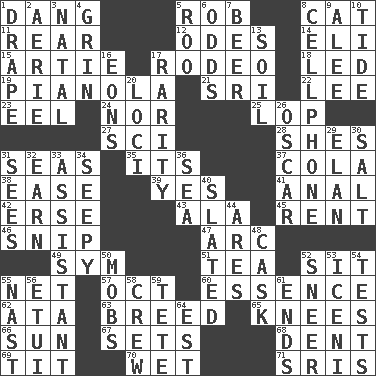ACROSS 1. Mild oath, euphamism for damn 5. Director Reiner 8. Domesticated feline 11. Bring up, as a child 12. Lyric poems 14. Connecticut Ivy Leaguer 15. Nick name for Arthur 17. Cowboy competition 18. Directed 19. Player piano 21. _ Lanka 22. Area sheltered from the wind 23. Snakelike fish 24. And not 25. Trim (branches) 27. _-fi 28. "______ My Girl" (Turtles hit) 31. Oceans 35. ___ a Wonderful Life 37. Root beer relative 38. Comfort 39. It is so 41. Of or related to the anus 42. Celtic language 43. In the manner of 45. Monthly bill 46. Sever or remove by pinching or nipping 47. Curve 49. Symbol (abbr.) 51. Afternoon social gathering 52. Be seated 55. Fish or hair follower 57. Sep. follower 60. Center 62. "One Day ___ Time" 63. A special lineage 65. Leg joints 66. Player for Phoenix 67. Arranges properly for use 68. Gouge 69. Teat (slang) 70. Dripping 71. Indian titles of respect DOWN 1. Window treatment 2. Nest on high 3. Relating to or accompanying birth 4. Smile widely 5. Friend of Pooh 6. Likelihood 7. Fermented drink made from hops 8. Portable communications device 9. Toward shelter 10. Periodic rise and fall of the sea level 13. Land 16. Immeasurably long periods of time 17. Noteworthy scarcity 20. Event scenes 26. Motion picture award 29. Liveliness 30. Table seasoning 31. Observes 32. Merit 33. Aide 34. Not well drained, as in land 36. Ocean 40. Scheduled 44. Ancient Greek god of war 48. Keg 50. Disorderly crowds 52. Scornful expression 53. Ancient Celtic tribe of eastern Britain 54. Trials 55. Political cartoonist Thomas 56. Needle case 58. Group working together 59. Wig 61. Extremities 64. Eastern Standard Time (abbr.)