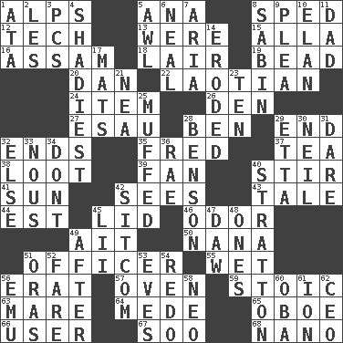 ACROSS 1. High mountains 5. Santa ___, CA 8. Drove too fast 12. Technician 13. We are 15. Silent film actress Nazimova 16. Indian state 18. Den 19. Necklace unit 20. One of the 12 tribes of Israel 22. Of or relating to Laos or its people 24. Detail 26. Lair 27. Son of Isaac 28. Benjamin's nick name 29. Conclude 32. Conclusions 35. Flintstone 37. Afternoon social gathering 38. Spoils 39. Air blower 40. Disorderly outburst 41. Player for Phoenix 42. Perceives with the eye 43. Lie 44. Eastern Standard Time (abbr.) 45. Flaplike covering 46. Scent 49. Small island 50. Grandmother 51. Person of authority 55. Dripping 56. Part of Q.E.F. 57. Baking chamber 59. Unemotional 63. Female horse 64. Ancient Persian 65. Mitch Miller's instrument 66. One who makes use of a thing 67. "Barney Miller" actor Jack 68. Billionth: prefix DOWN 1. "One Day ___ Time" 2. French article 3. Personal Computers (abbr.) 4. Most dark, concealed or hidden 5. Leather borer 6. Anneal 7. Operatic vocal solo 8. Unit of acoustic absorption 9. Entreaty 10. Liveliness 11. Male parent 14. Worn away 17. Floor protectors 21. Teachers' org. 23. "___ Little Indians" 25. Performed or handled clumsily 28. Gillaume's butler role 29. Singer James 30. Famous astronaut Armstrong 31. Have the gumption 32. Otherwise 33. Good sense 34. Do not 36. Actress Charlotte 40. Ski resort town in Vermont 42. "Cheers" or "Ellen" 45. Cards in a Roman deck? 47. Simpleton 48. Singles 49. Following 51. Mouths or openings 52. Conductor's collection 53. Nights before holidays 54. Redecorate 56. Australian flightless bird 58. Modern: prefix 60. Chief or king in Benin or Nigeria 61. Electrically charged atom 62. Corporate head (abbr.)