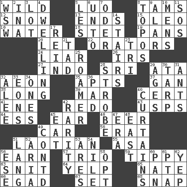 ACROSS 1. Rampant 5. Nilotic language 8. Scottish caps 12. Frozen precipitation 13. Conclusions 15. Margarine 16. Wetness 18. Proofreading order 19. Baking dishes 20. Allow 22. Speakers 24. One who doesn't tell the truth 26. Big collection agency 27. Southeast Asian peninsula 28. _ Lanka 29. _ moment's notice (2 wds.) 32. Period of immesurable duration 35. Tenement units (abbr.) 37. Separate the seeds from cotton 38. Protracted 39. Impair 40. Certainty 41. Compass dir. 42. Do over again 43. United States Postal Service (abbr.) 44. Curvy letter 45. Hearing organ 46. Fermented drink made from hops 49. 4-wheeled motor vehicle 50. Part of Q.E.F. 51. Of or relating to Laos or its people 55. White ___ sheet 56. Merit 57. Musical group of three 59. Likely to tip or tilt 63. In a ____ (agitated or irritated) 64. Sharp bark 65. Nathan's nickname 66. Mild oath 67. Put into a specified state 68. Fastener DOWN 1. Compass dir. 2. _ tizzy (2 wds.) 3. Car dealer's back yard 4. Residence 5. French article 6. To (old English) 7. Baltic tributary 8. Literary convention 9. Having or resembling wings 10. Not women's 11. Distress signal 14. Flight of steps 17. It's straight from the horse's mouth 21. Small boy 23. Three (prefix) 25. Nomad 28. Disco prop 29. Grows older 30. Canvas cover 31. Pismires 32. Toward shelter 33. Immeasurably long periods of time 34. Washington bills 36. Writing tablet 40. Window treatments 42. Noteworthy scarcity 45. Erode 47. Period 48. Compass direction 49. Continued (abbr.) 51. Long (Scottish) 52. Roberta Peters solo 53. Ancient Greek god of war 54. "Death on the ____" 56. Compass dir. 58. Choose 60. Baking dish 61. Parent Teacher Association (abbr.) 62. Slangy assent