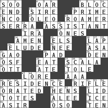ACROSS 1. "Barney Miller" actor Jack 4. Rowing implement 7. Group of countries in special alliance 11. Conclusion 12. Title for a man of rank and authority 13. A-one 14. Non-commissioned officer (abbr.) 15. Margarine 16. Wanderer 17. Spanish missionary in California 19. Helper 21. Lyricist Gershwin 23. Singles 24. So be it 25. Raised railways 26. Infant locale 29. Dodge 30. Born 31. White ___ sheet 32. E Mali city 33. Groovy apt. 34. Lair 35. Order of Saint Francis (abbr.) 36. Consume 37. Any of the three canals of the cochlea 40. Baseball player Mel 41. Had dinner 42. Lacquered or enameled metalware 43. Old wives' tales, e.g. 45. Auto club (abbr.) 46. Dwelling 51. Ransack; plunder; pillage 55. Declaimed 56. Coop moms 58. Hat (slang) 59. Lugs 60. Toward shelter 61. Frozen water 62. SW Saudi Arabia district 63. Bear (Spanish) 64. "___ Little Indians" DOWN 1. Elected reps. 2. Single time 3. Aroma 4. Lubricate 5. Length times width 6. Vintage cars 7. Naughty children 8. Pale green bean 9. Sign of things to come 10. Sure thing 12. Flew 13. Airs 16. Wash lightly 18. Tall New Zealand timber tree 20. Having a sole or soles 22. A saturated hydrocarbon 24. At or to great height 25. Maternal 26. Dipping utensil 27. At sea 28. Baking dish 29. Compass direction 32. Thick or sticky substance 33. Eucharist need 36. Having ears or earlike features 37. R.R. building 38. Rough 39. Mountain range southwest of Kyrgyzstan 43. 61 cubic inches 44. Lyric poems 46. Roll call or roster of names 47. Greek god of love 48. Suttee (variant) 49. US Secretary of Labor Elaine L. _ 50. Snakelike fish 52. Sudden quick movement 53. Louse (plural) 54. Paradise 57. Modern: prefix
