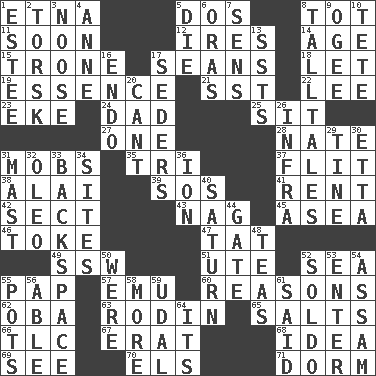 ACROSS 1. Inactive volcano in Sicily 5. Two (Sp.) 8. Small child 11. Within a short period 12. Angers 14. Grow older 15. Heavy duty weighing machine 17. Seines 18. Allow 19. Substance 21. Fast jet (abbr.) 22. Area sheltered from the wind 23. Make supply last 24. Male parent 25. Be seated 27. Single 28. Nathan's nickname 31. Disorderly crowds 35. Three (prefix) 37. Secret move to avoid paying debts 38. Jai ____ 39. Distress signal 41. Monthly bill 42. Religious group 43. Tired old horse 45. At sea 46. Puff or smoke 47. Make lace 49. Compass dir. 51. Shoshoni 52. Ocean 55. Infant food 57. Australian flightless bird 60. Thinks logically 62. Chief or king in Benin or Nigeria 63. "The Thinker" sculptor 65. Table seasonings 66. Affectionate concern, for short 67. Part of Q.E.F. 68. It may be bright or harebrained 69. Observe 70. Raised railways 71. Dormintory (informal) DOWN 1. First name in cosmetics 2. Cod relative 3. Trap for birds or small mammals 4. Queen of England 1702-14 5. Expire 6. Mouths or openings 7. Elected reps. 8. Baron Munchausen's specialties 9. Double curve, resembling the letter S 10. Wig 13. Fast planes 16. Inside; within (prefix) 17. Spring feasts 20. Patter 26. Kind of red light 29. Prong on a fork 30. Singer James 31. Vertical spar for supporting sails 32. Margarine 33. Keyboard key 34. Settings 36. Electrically charged atom 40. Titan orbits this 44. Yard entry 48. Beverages made from leaves 50. We are 52. Twentieth part of a lira 53. Keyboard key 54. Indian state 55. Plant holders 56. Competent 58. Greater amount 59. Hereditary estate 61. Expressed in words 64. ___ a Wonderful Life