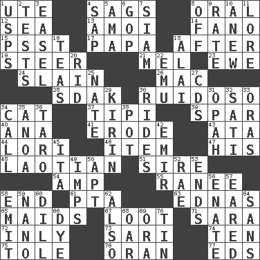 ACROSS 1. Shoshoni 4. Settles 8. Taken by mouth 12. Ocean 13. Mine, in Marseilles 14. Papal veil 15. Inconspicuous attention getter 17. Dad 18. Following 19. Bull 21. Cartoonist voice _ Blanc 23. She-sheep 24. Killed 26. Big _ 28. Neighbor of Neb. 30. Noisy, rowdy, vocal (Spanish) 34. Domesticated feline 37. Native american tent (variation) 39. Practice fight 40. Santa ___, CA 41. Eat (away) 43. "One Day ___ Time" 44. Australian parrot (variant) 46. A whole individual unit 47. Part of HMS, perhaps 48. Of or relating to Laos or its people 51. Beget 54. Electrical Unit 55. The wife of a rajah (variant) 58. Conclude 61. Parent Teacher Association (abbr.) 63. Ferber et al. 65. Unmarried girls 67. Spoils 71. "Two Mules for Sister ____" 72. In an inward manner 73. Indian skirt 74. "___ Little Indians" 75. Lacquered or enameled metalware 76. NW Algerian seaport 77. Begley and Asner DOWN 1. United States Postal Service (abbr.) 2. Trials 3. Artist's stand 4. Plant excrement 5. Nanny (var.) 6. Grand Old Party 7. Thailand, formerly 8. Below a satisfactory level 9. Pace 10. Afresh 11. Old wives' tales, e.g. 16. Beverages made from leaves 18. Mountain range southwest of Kyrgyzstan 20. To free from 22. Australian flightless bird 25. Nathan's nickname 27. Music discs 29. Japanese brewing company 30. Amusement-park features 31. Brightly colored fish 32. Suttee (variant) 33. Mouths or openings 34. Give a ring to 35. Small Philippine buffalo 36. Pacific island yam 38. Cooking vessel 42. Arab leader 45. Call ___ day 49. Naughty children 50. Fitting 52. Actress Charlotte 53. Conclusions 56. Related on the mother's side 57. Having ears or earlike features 58. Give off 59. Billionth: prefix 60. Deli pickle 62. In addition 64. Without 66. Color 68. Boat paddle 69. Mouth or opening 70. Metal container